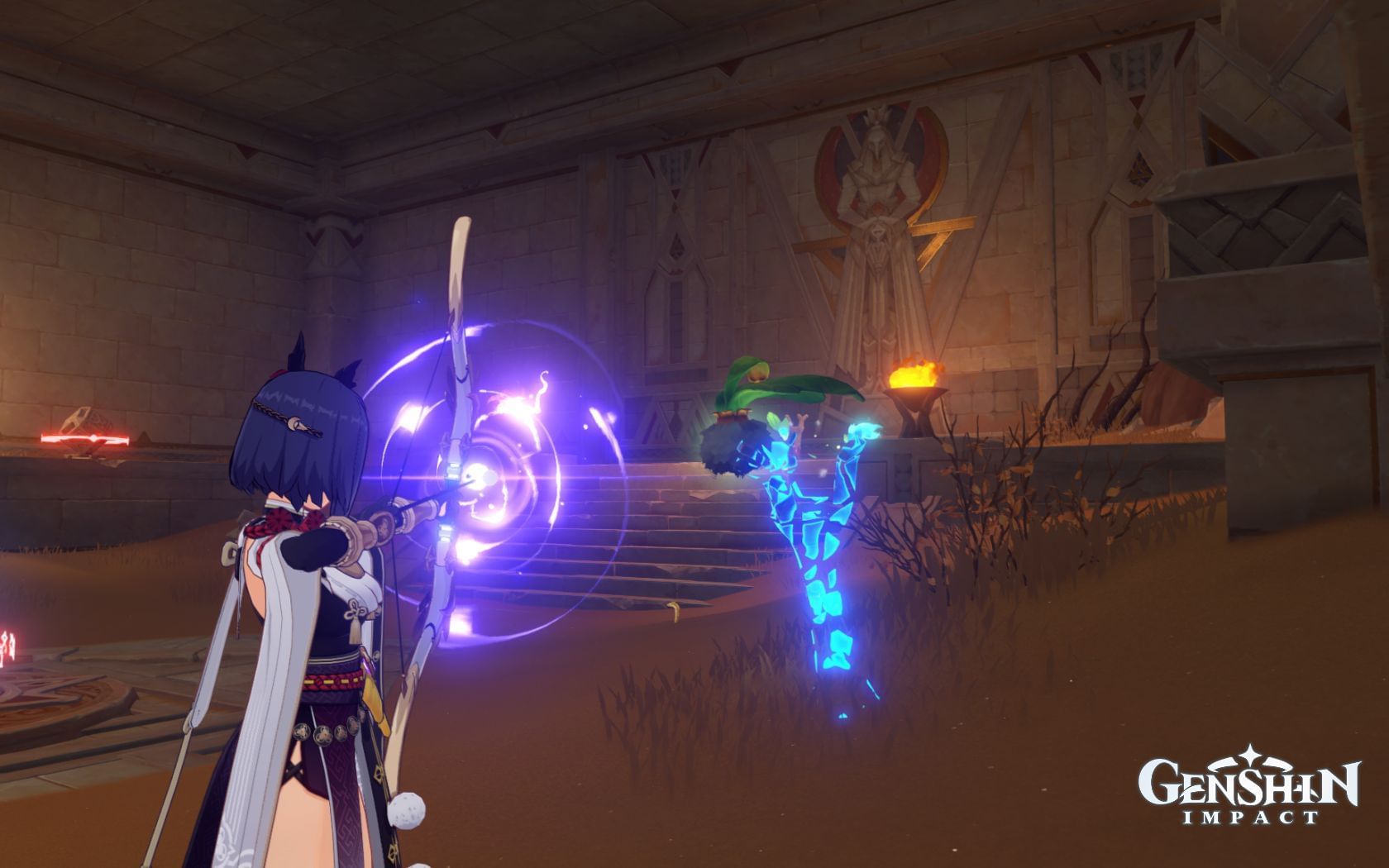 The nearby Dendro creature that flies around the room will eventually approach this blue torch. Hit it with an Electro attack to turn the blue torch into a normal one.