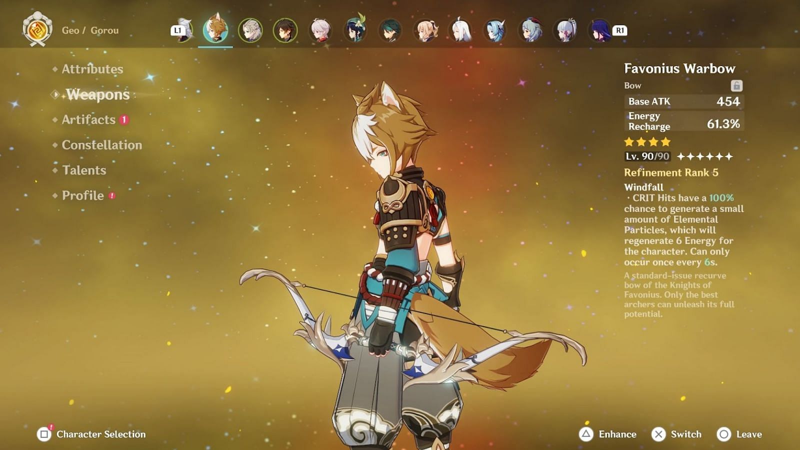 As far as artifact stats go, Genshin Impact players should prioritize DEF% and Energy Recharge on Gorou. If the user plans to use Favonius Warbow, they should also have a decent amount of CRIT Rate substats on his artifacts.