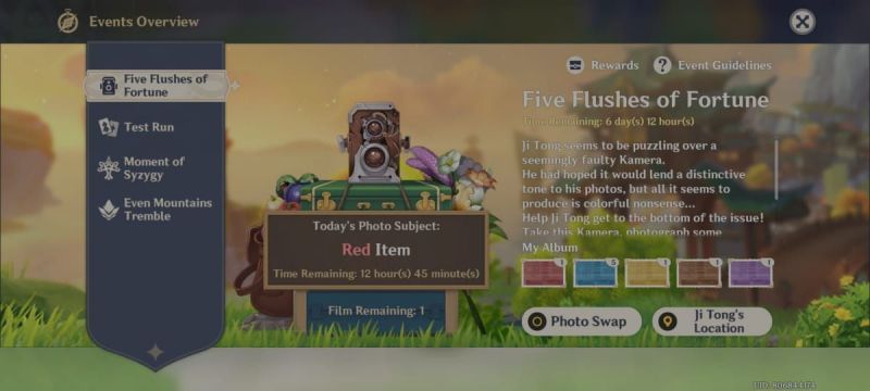 Players will get ten films per day, which means ten pictures can be captured to collect the colors every day. To capture, players will need to equip the Kurious Kamera obtained from Ji tong. After capturing a red item, a photograph of a random color will be obtained. Five colors of film: Pale Gold, Ocher, Purple Aster, Crimson, and Ultramarine need to be collected to claim the "Fortune Trove" from Ji Tong.
