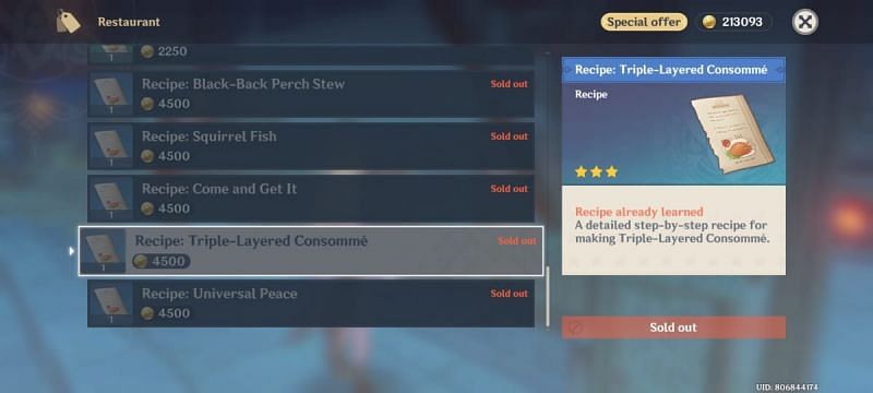 Gamers can purchase the recipe for the Triple-layered Consomme from Wanmin Restaurant in Liyue Harbor. To buy it, they have to approach Chef Mao in the Wanmin Restaurant and scroll down the restaurant menu to find the recipe.