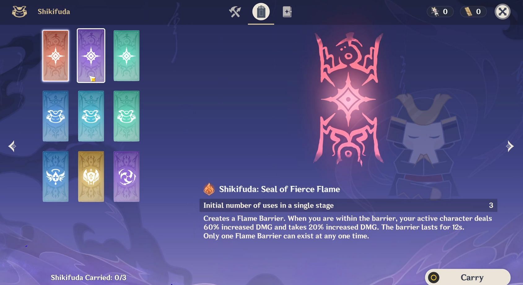 For the Shikifuda, you can choose three out of nine different ones. These charms are akin to buffs for the characters in the team. Note that you cannot change the Shikifuda after you start the challenge.