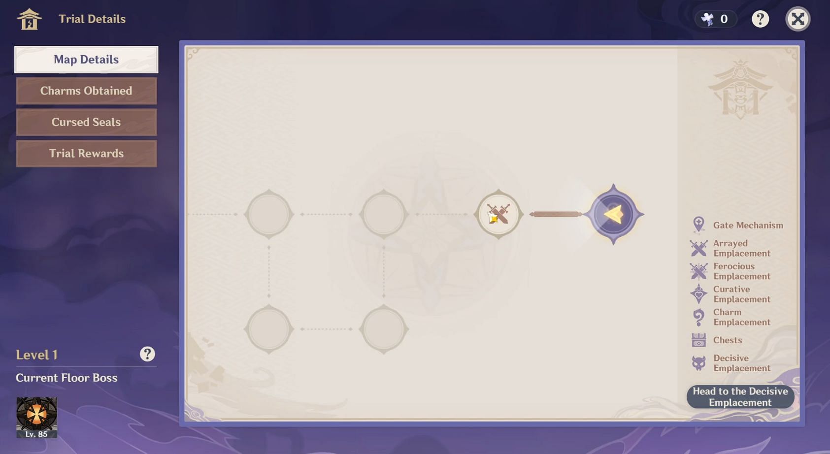 In the domain, there are two floors with multiple rooms on each floor. You can explore the rooms to search for treasure chests or go straight to the boss fight: Decisive Emplacement. To complete the trial, your main task is to complete the Decisive Emplacement on each floor in the domain.
