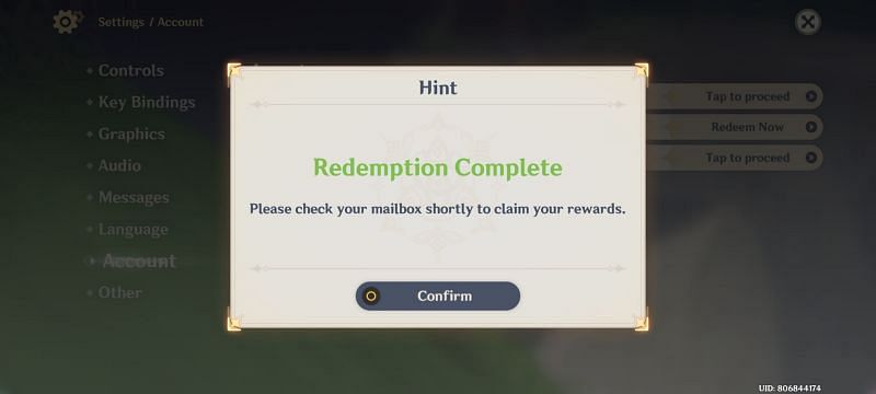 - The code will then successfully be redeemed, and the 60 Primogemswill be sent to the player's in-game mail.