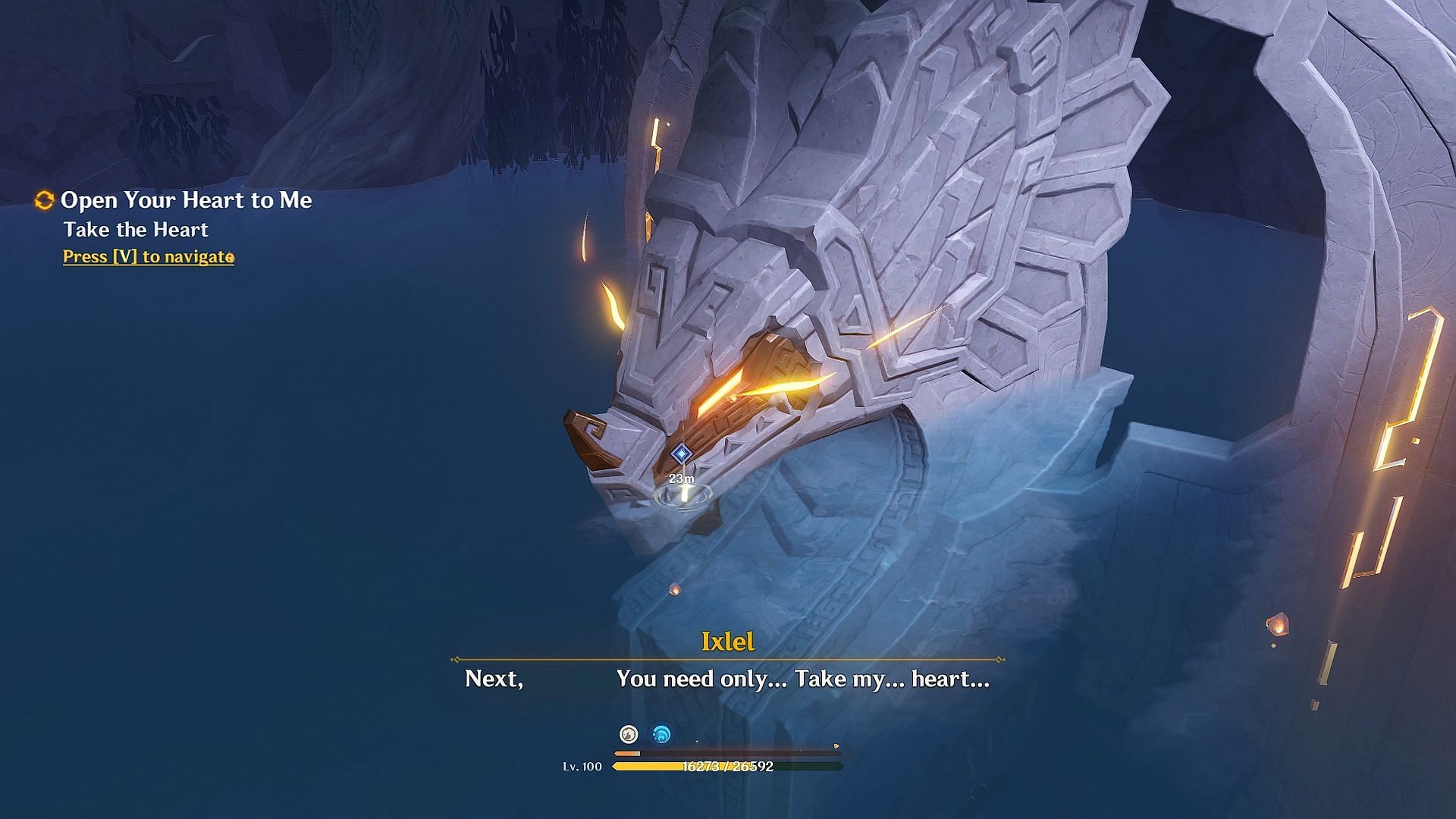Finally, investigate the shining spot at Ixlel's mouth to take her heart. This will conclude the Open Your Heart to Me quest in Genshin Impact.