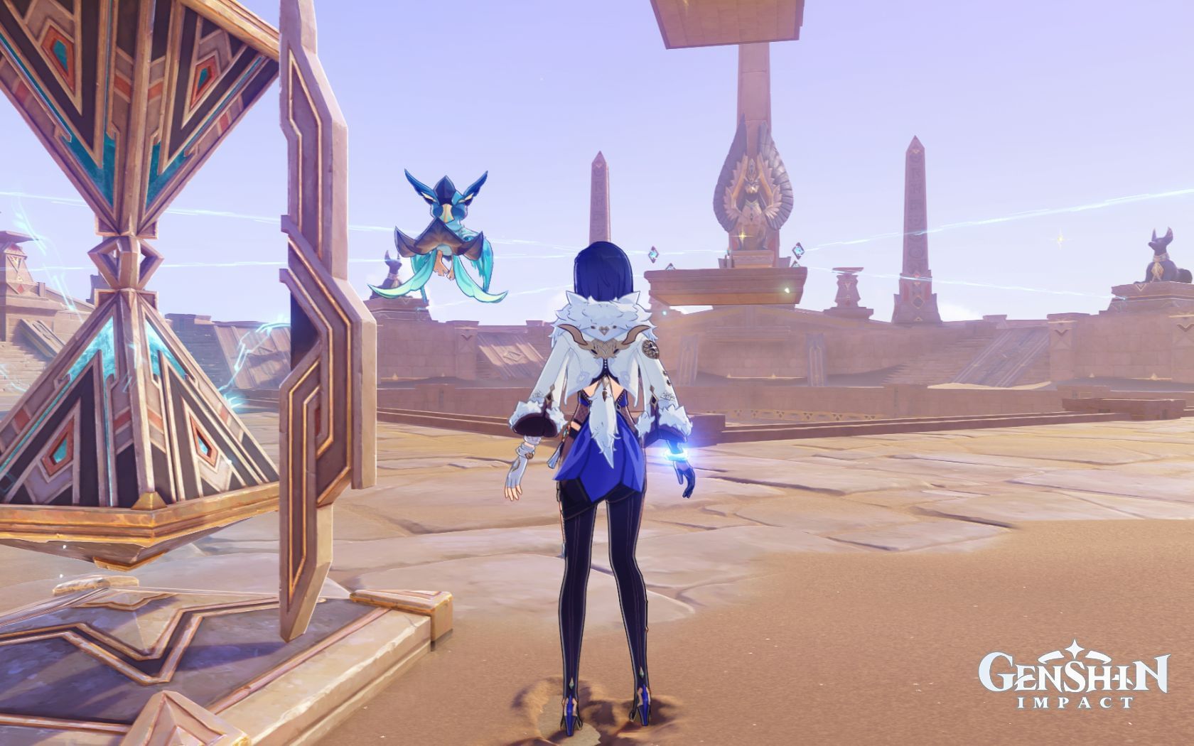 You must rotate this Genshin Impact mechanism twice so that it shoots a beam of light toward a giant obelisk. Once that's done, return to one of the two hourglasses — it doesn't matter which one.