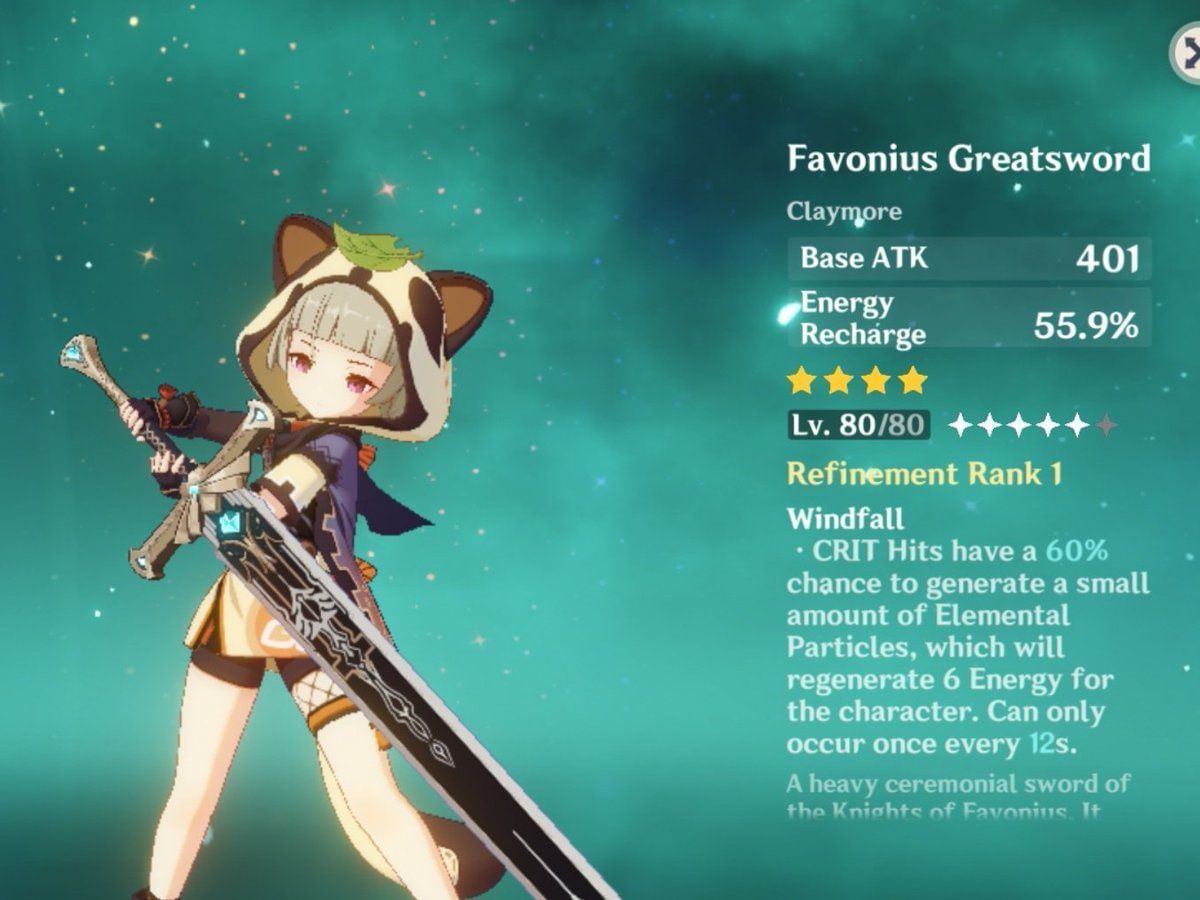 Favonius Greatsword has a far higher Energy Recharge stat than Sacrificial Greatsword. However, the latter's effect of potentially resetting her Elemental Skill can be a huge advantage.