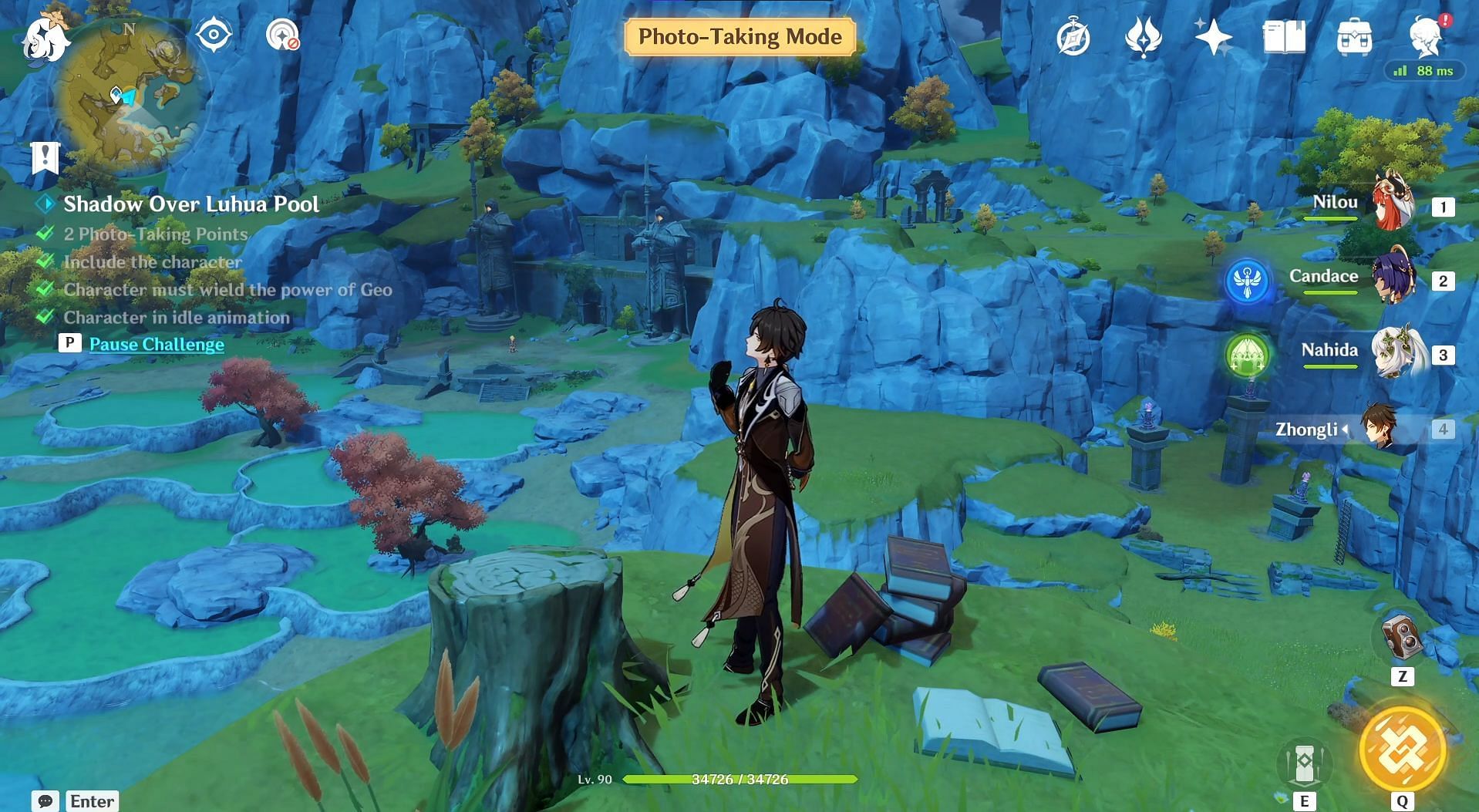 Shadow over Luhua Pool is the second challenge in the Greenery Chapter, located in Luhua Pool of Liyue. Furthermore, players must follow the conditions below before taking a photograph to complete this challenge: