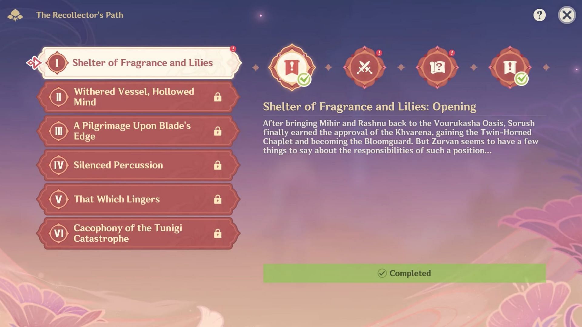 Clearing both challenges will complete the Shelter of Fragrance and Lilies in Genshin Impact. Overall, Recollectors' Path can be a rewarding event for those who are either saving for future characters or gathering pulls for Baizhu and Ganyu.