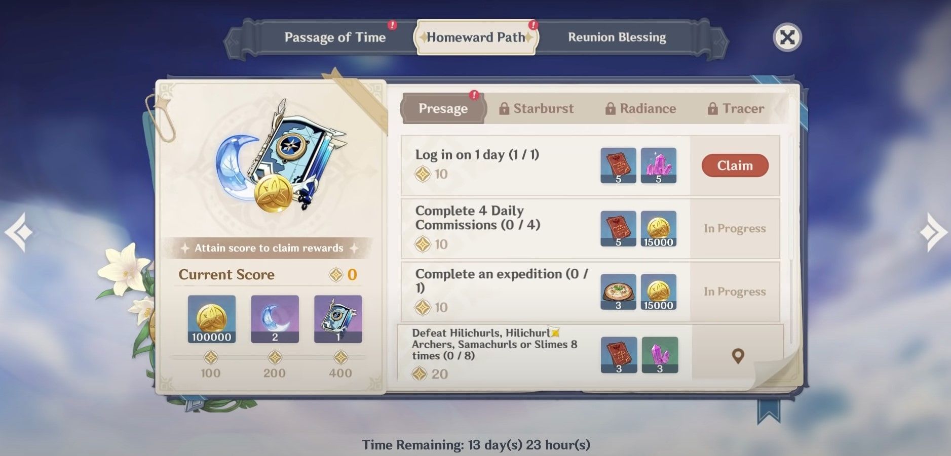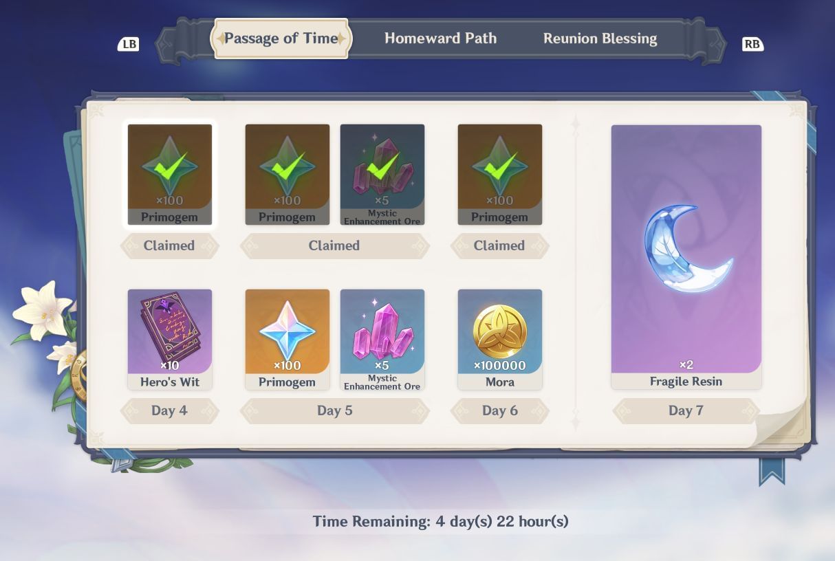 Genshin Impact players need to log in for seven days to complete Passage of Time. The following is a list of every day and rewards: