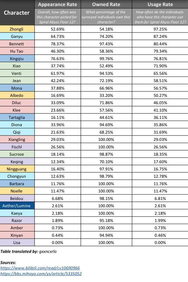 This list shows the strongest characters in the opinions of these high-tier Chinese players, though it might not apply to all players. These lists have been compiled from both P2W and F2P players, so these characters might not be as powerful without Constellations.