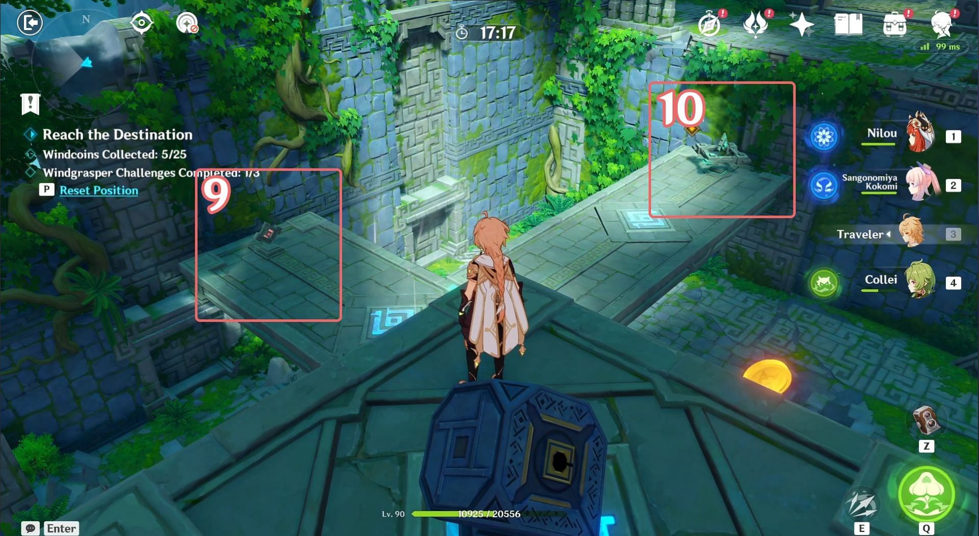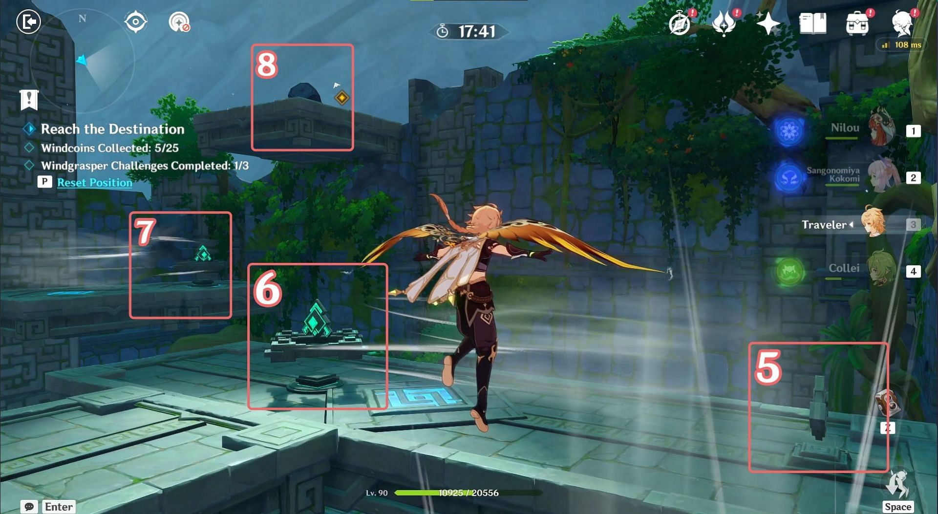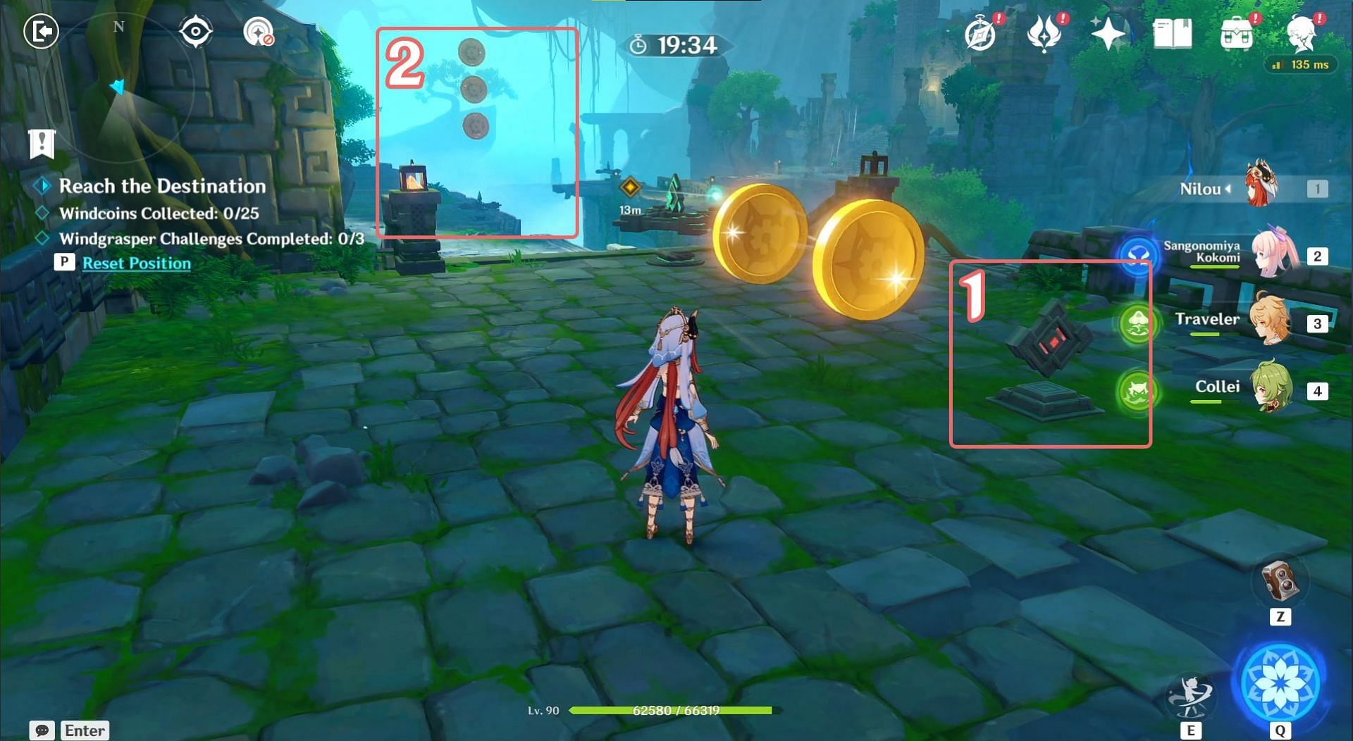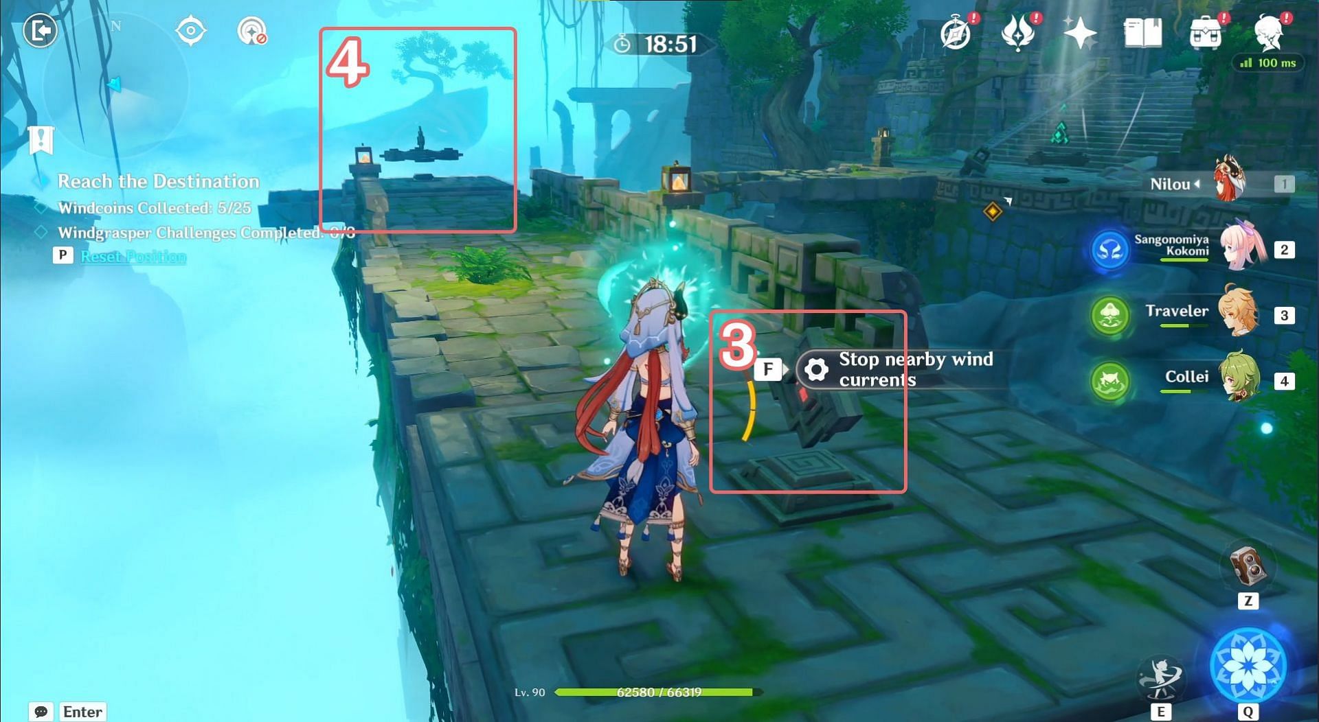 Once Genshin Impact players reach the bottom of the platform, interact with the red mechanism to stop the wind current and collect both Windcoins and Windgrasper Challenges until they reach the green mechanism at the end of the road. Change the wind current direction after collecting all the Anemo particles in the area and glide above to complete the Windgrasper Challenge.