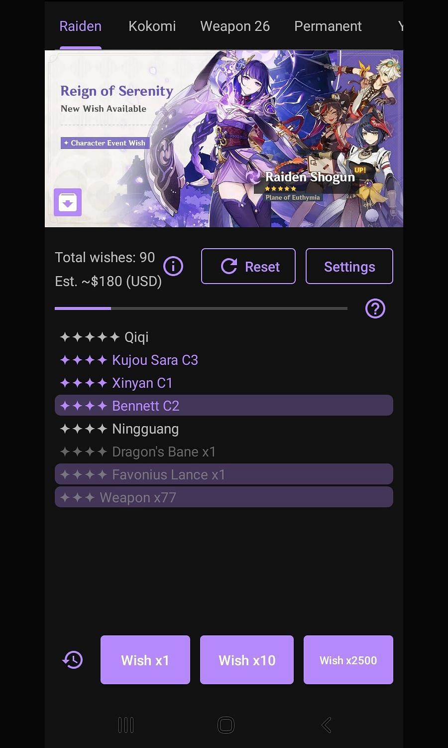 In this example, 90 Wishes have already occurred. Sadly, there was no Raiden Shogun in this batch of pulls. If a player decided to buy 90 Wishes with real-life money, it would cost them approximately 180 USD.