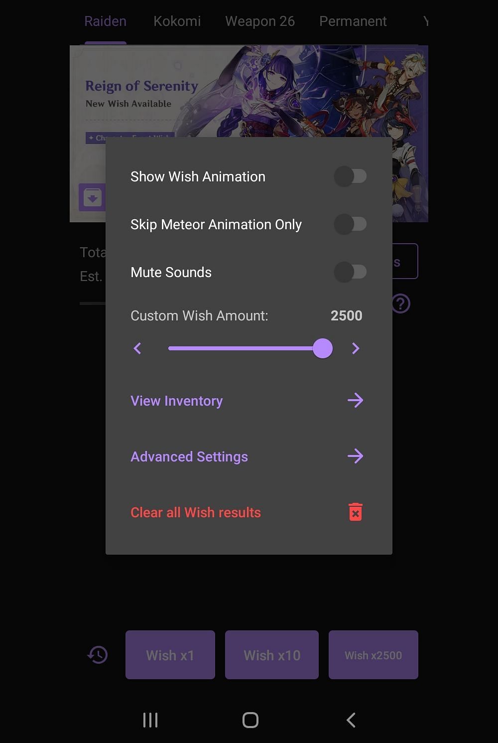 It's worth mentioning that one can use either the "Clear All Wish Results" option here or "Reset" on the home page to clear their inventory. Either way, it's time for a quick demonstration of how it works with the Raiden Shogun's rerun.