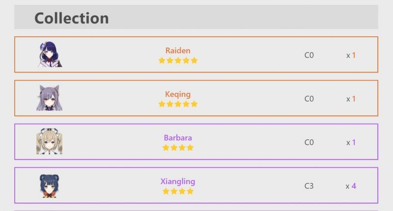 If players want to see the highlights of their wishes, they can check the “Collection” tab. Here, users can see their wishes in order of rarity. If players have summoned a character more than once, it will note how many by listing their constellation level.