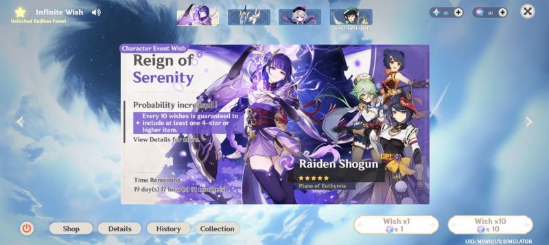 Wish simulators replicate the Genshin Impact gacha, allowing players to try an unlimited amount of wishes on any current banner. While Raiden Shogun’s banner is active, players can test their luck to see how many wishes it might take to summon her.