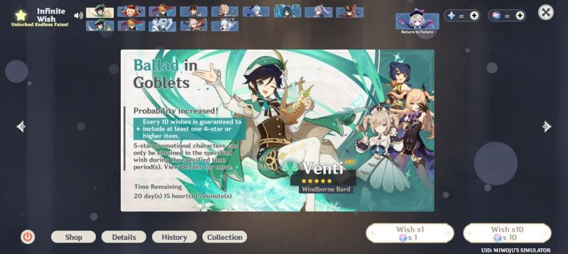 Miwoju’s wish simulator also lets users wish from past character banners if they feel salty or nostalgic. The “Time Travel to past” button at the top of the screen has most past character banners available for summons.