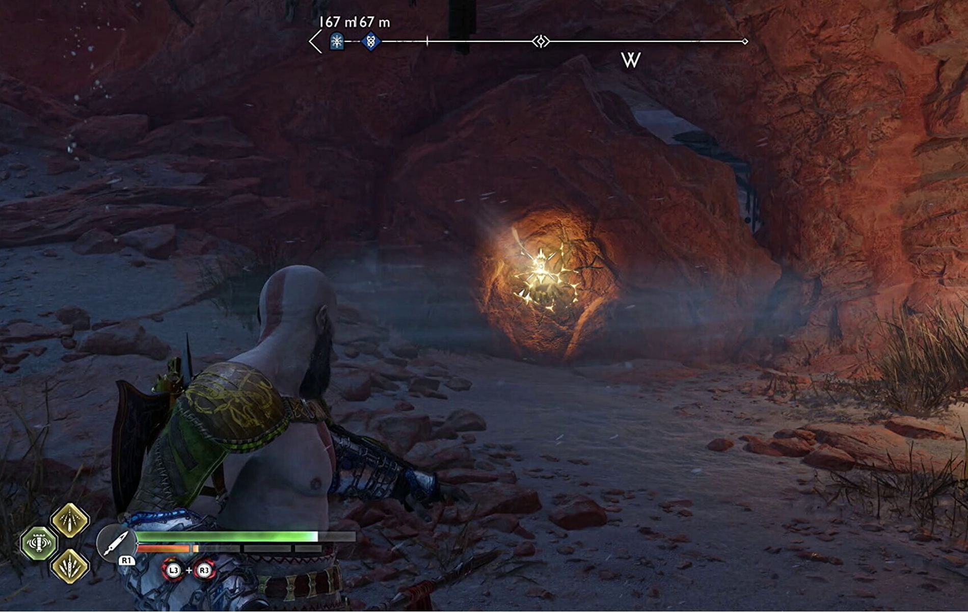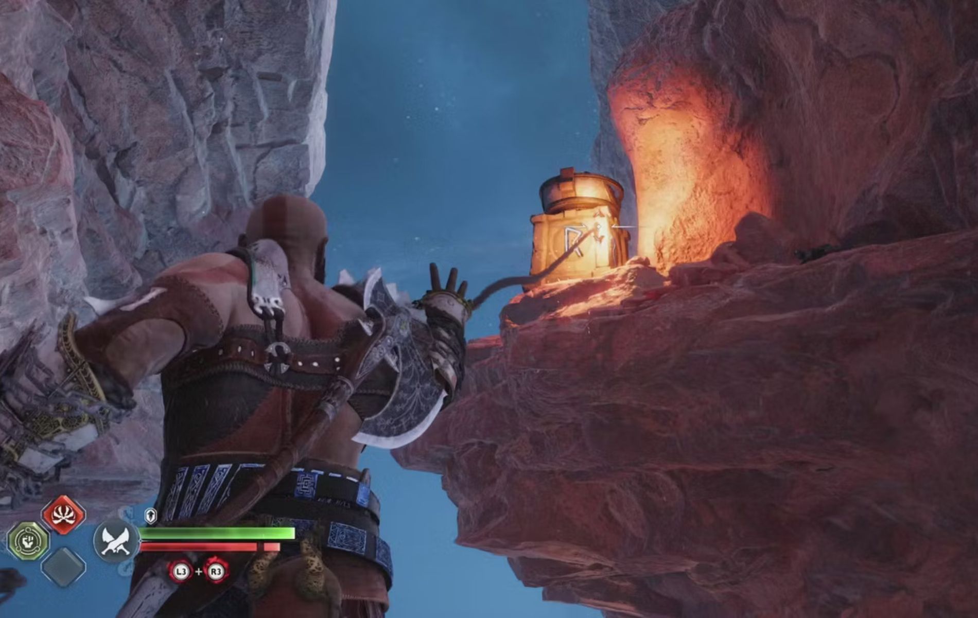 The first torch is located opposite the Nornir Chest, right on the edge of the cliff. To light a torch, players need to hold their L2 button and lock aim on the target (in this case, the torch which needs to be ignited) before tapping the R2 button. This will result in Kratos igniting the torch using his Blades of Chaos.