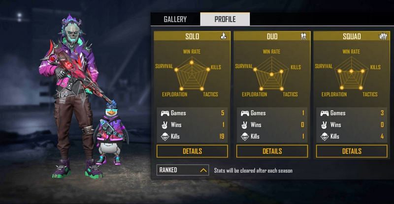 Apart from this, the content creator has participated in five solo games and has a single Booyah, making his win rate 20%. He also has 19 frags with a K/D ratio of 4.75.