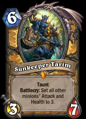 Sunkeeper Tarim is another card that is extremely strong in both Arena and Constructed. It has Taunt, which will protect your 3/3 minions. It can also punish your opponents bigger minions such as Giant Mastodon or Worgen Abomination or Linecracker. You can also Discover Sunkeeper Tarim through Stonehill Defender, a common card. So it is not that hard to get him even if you don't draft him!