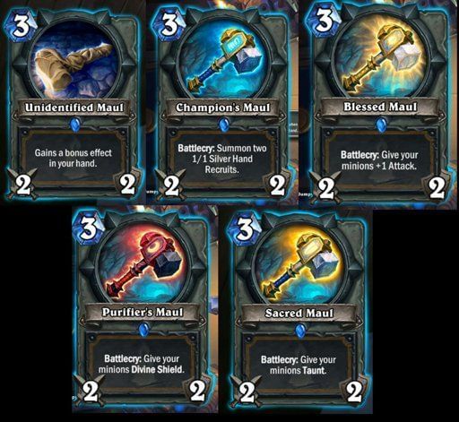 Unidentified Maul and its variations are a powerful include in Odd Paladin decks. A fairly statted weapon, its Battlecry can be used to flood the board, protect your minions and your hero while being able to mow down enemy minions.