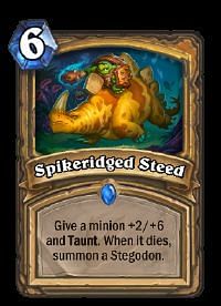 Spikeridge Steed is a powerful spell which gives you +4/+12 worth of stats on taunt. It buffs a minion and summons a 2/6 taunt. It was used a lot in Lynessa and Kaleidosaur decks, but recently sees play in Shirv'allah based decks.