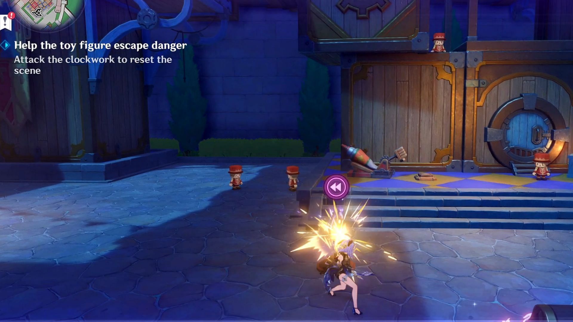 Once you attack the Constellation Clockwork device, the scenario will start rewinding, and the toy guard who had fallen down the cliff will get back up.