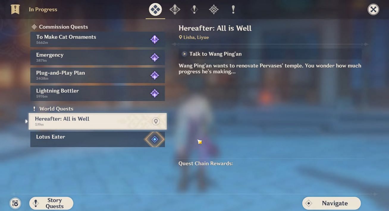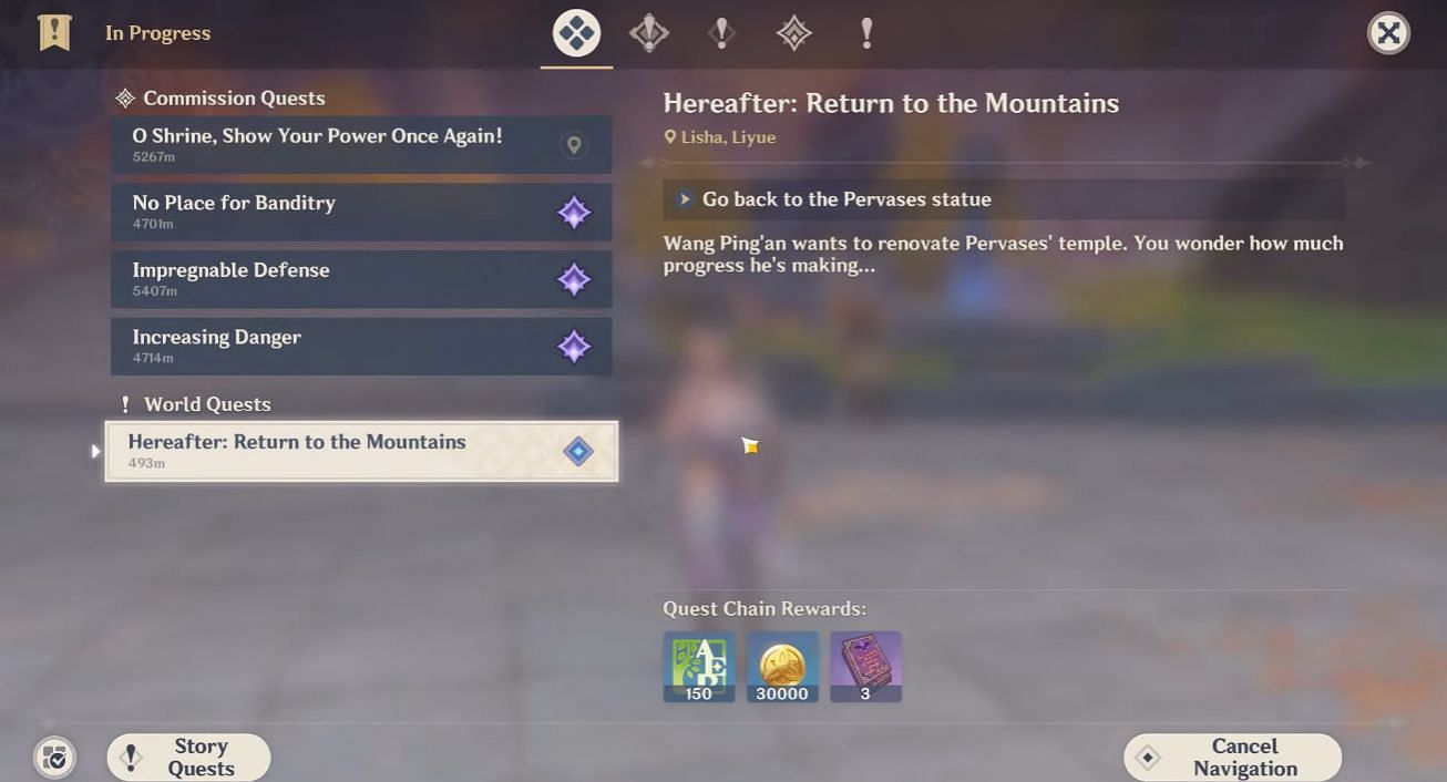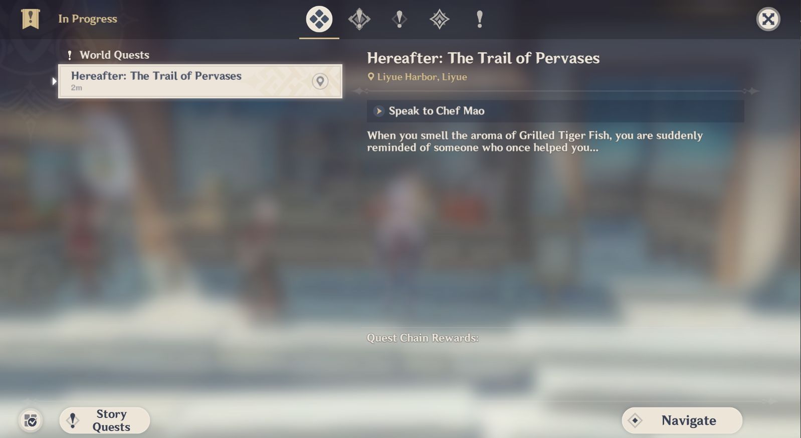 After completing Xiao's quest, you will automatically obtain the 'Hereafter: The Trail of Pervases' quest when walking near Chef Mao in Liyue. The first task you need to do is teleport to the waypoint southeast of Mt. Tianheng and meet with Xiao.