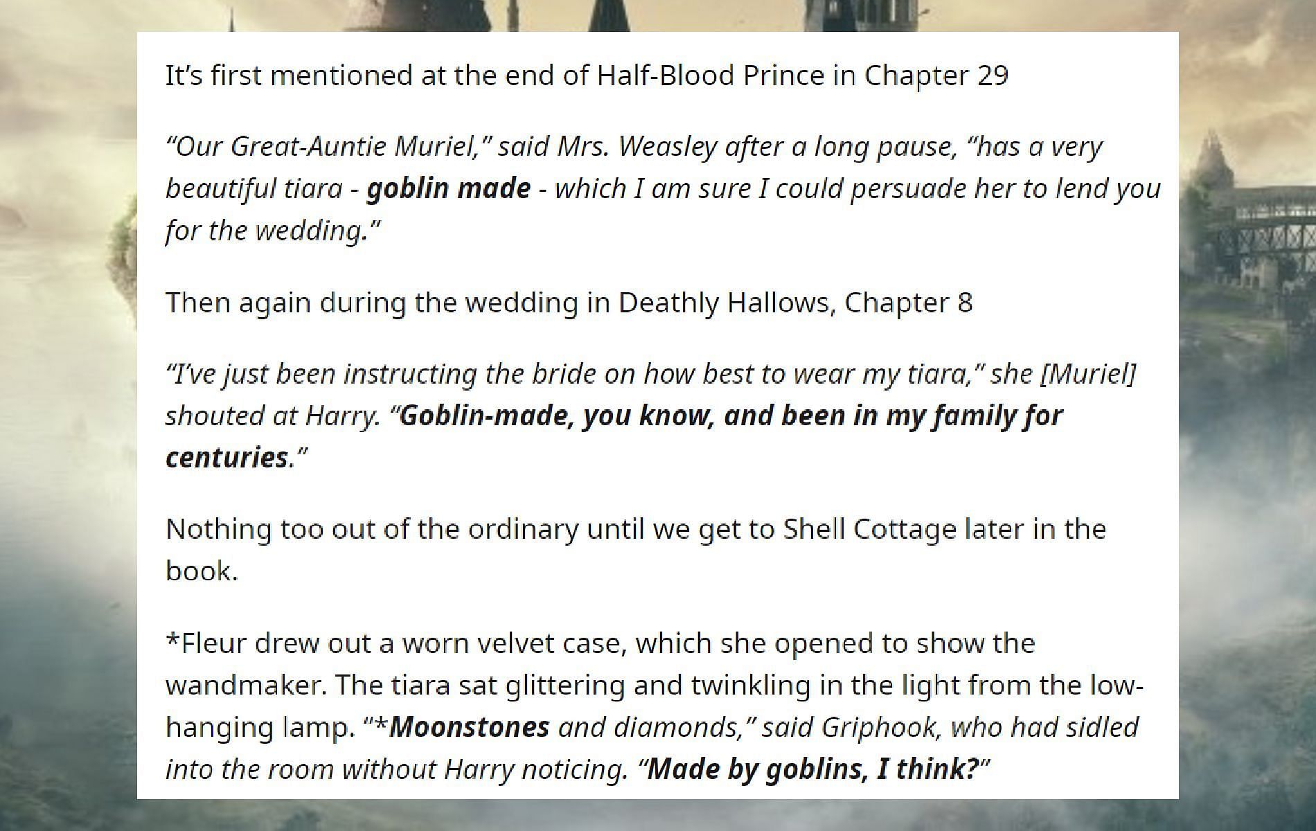 "Here we have canon that places moonstone well within goblins’ knowledge of imbuing it into things that they make; As well as it being in the family “for centuries” that allows some leeway to assume it could be from around the game’s time period. Even if the tiara was made prior to the game, it doesn’t really matter as we have a connection between the material and the goblins' use of it."