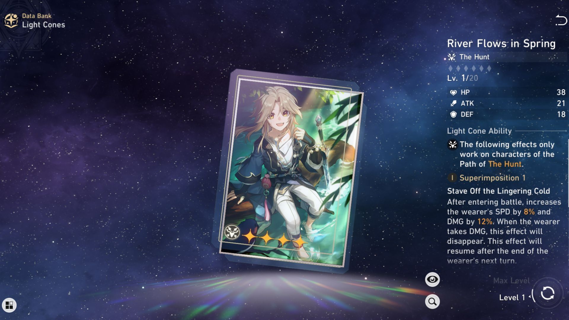 The best 4-star Light Cone you can use on Boothill is River Flows in Spring. Although the base stats are lower than the 5 stars, this Light Cone is one of the best picks for Boothill as the unique effect, Stave Off the Lightning Cold, boosts the user’s SPD. Additionally, it boosts the wearer’s overall damage, allowing Boothill to deal a significant amount of damage to his adversary.