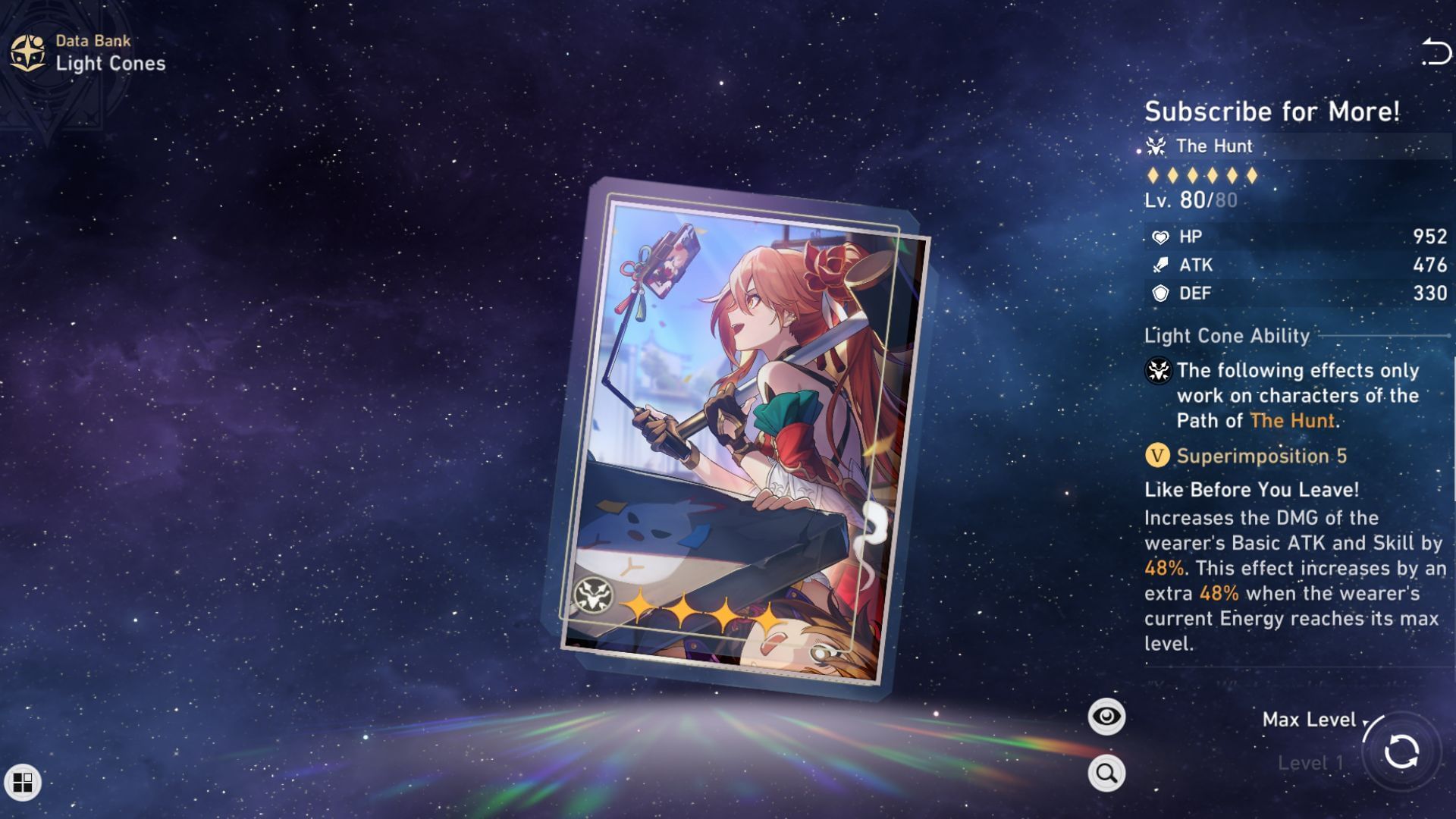 Subscribe for More! is another 4-star Light Cone you can use on Boothill. The unique effect of this Light Cone increases the wearer’s Basic ATK and Skill damage. Moreover, when the user has their Ultimate ability, the damage multiplier gets an additional boost, allowing the wearer to unleash an absurd amount of damage.