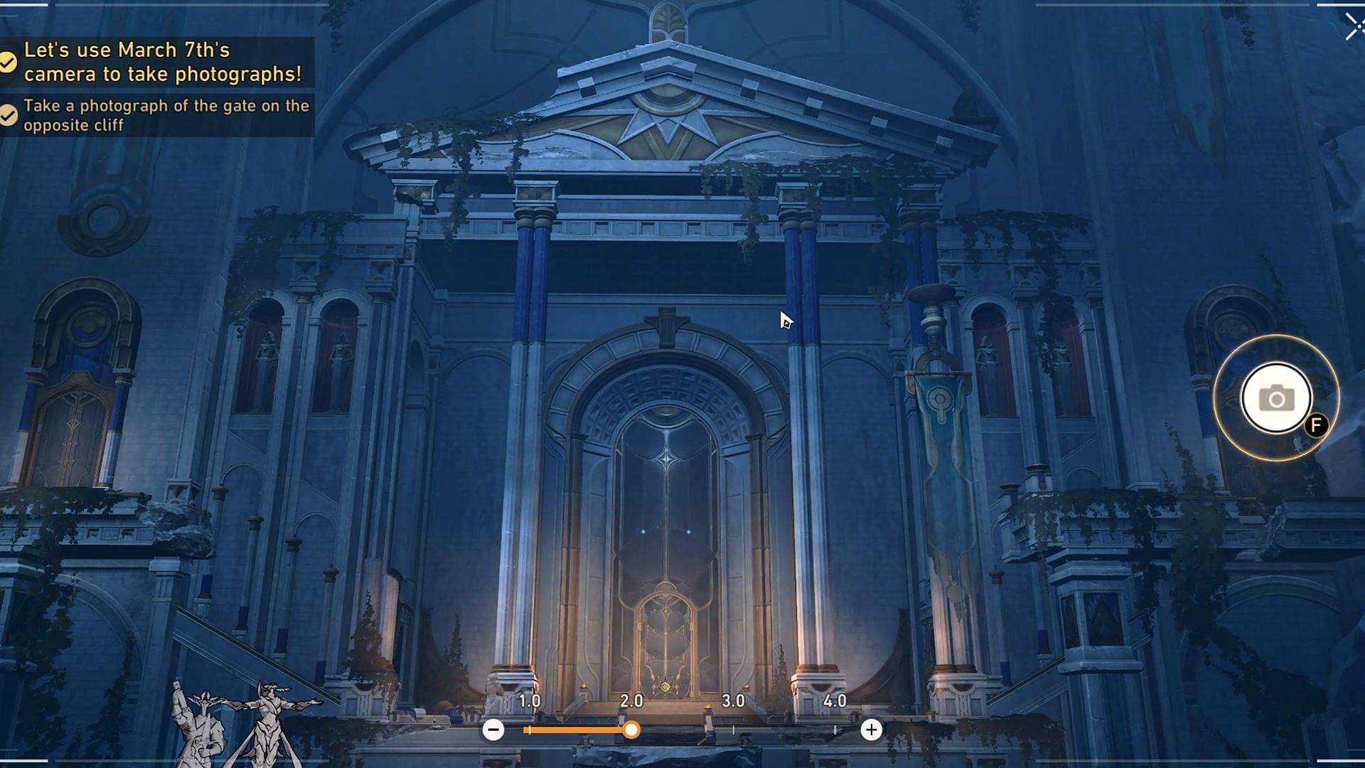 Now, you will need to take a picture of the "gate on the opposite cliff." Adjust the camera angle and zoom however you want, making sure that you get the entire gate in the frame. Take the photograph.