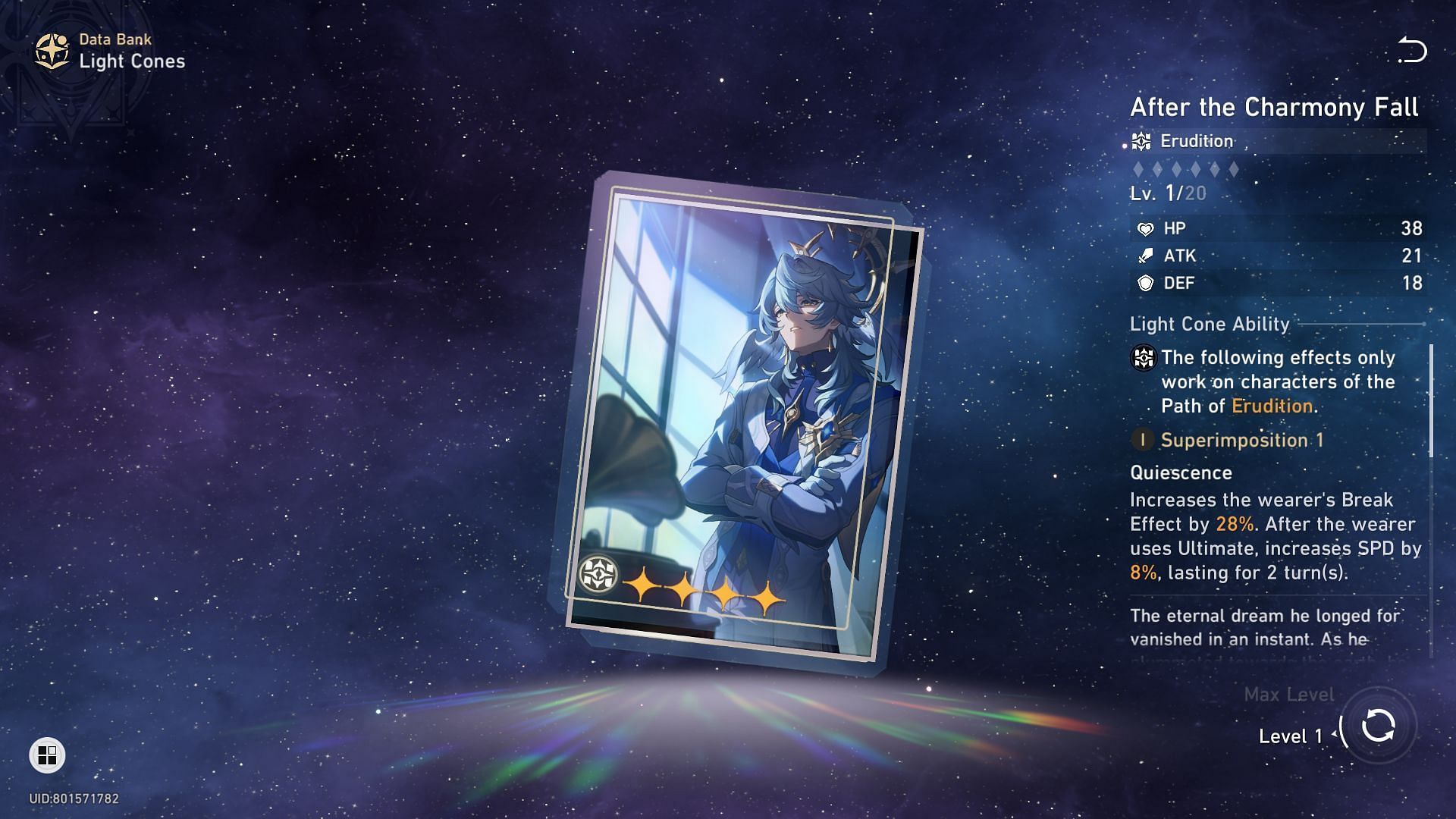 In the 4-star Light Cone category, After the Charmony Fall is an excellent pick for Rappa in Honkai Star Rail, as it will increase her Break Effect by 28% at base refinement. The LC will increase her SPD by 8% for two turns after she uses her Ultimate.