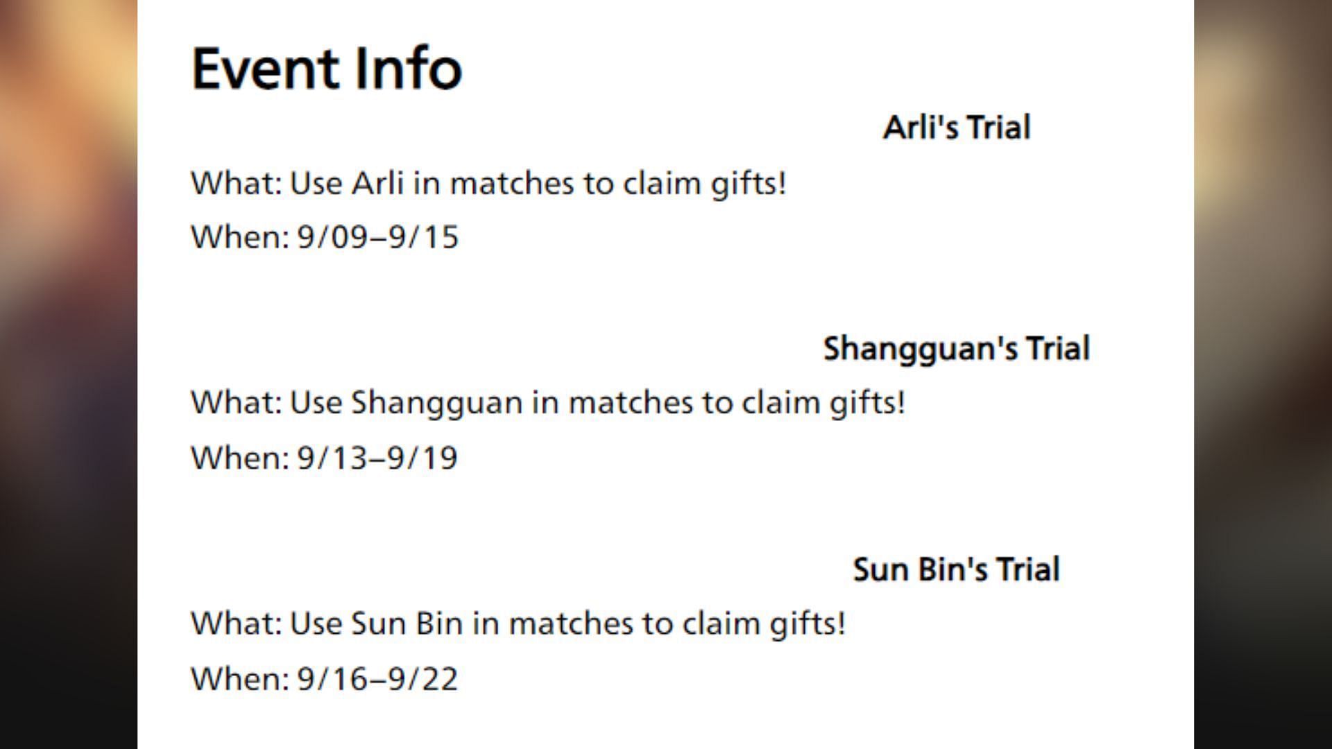 - Arli’s Trial: This event will start from September 9 to September 15, 2024. Players can claim several gifts by using Arli in PvP matches.