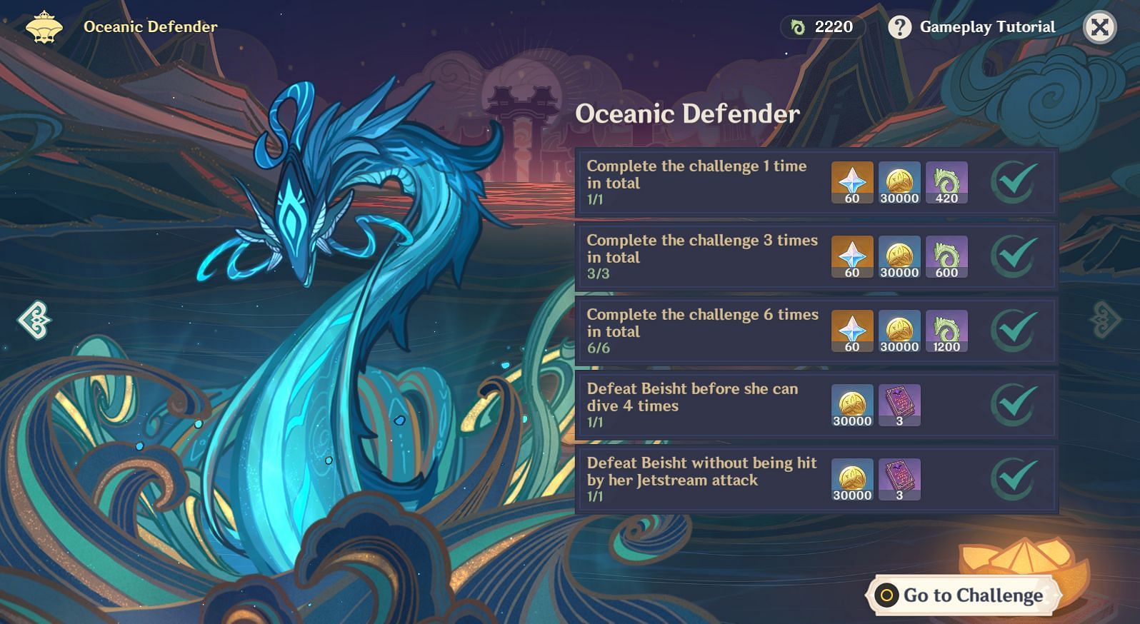 Travelers can participate in the Oceanic Defender challenge, where they will be transported to a special area and defeat Beisht, an event boss. By completing the challenge, players will receive Conquest Talismans from the event page, and it can be exchanged for one Liyue four-star character and Ningguang's new outfit in Genshin Impact.