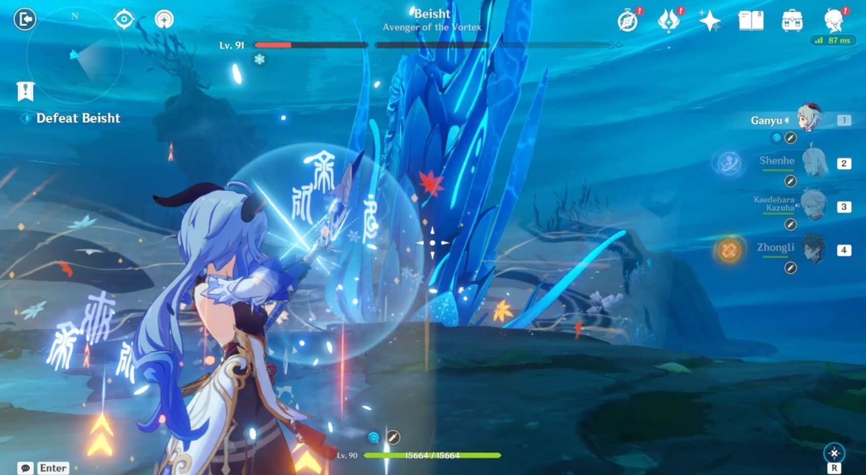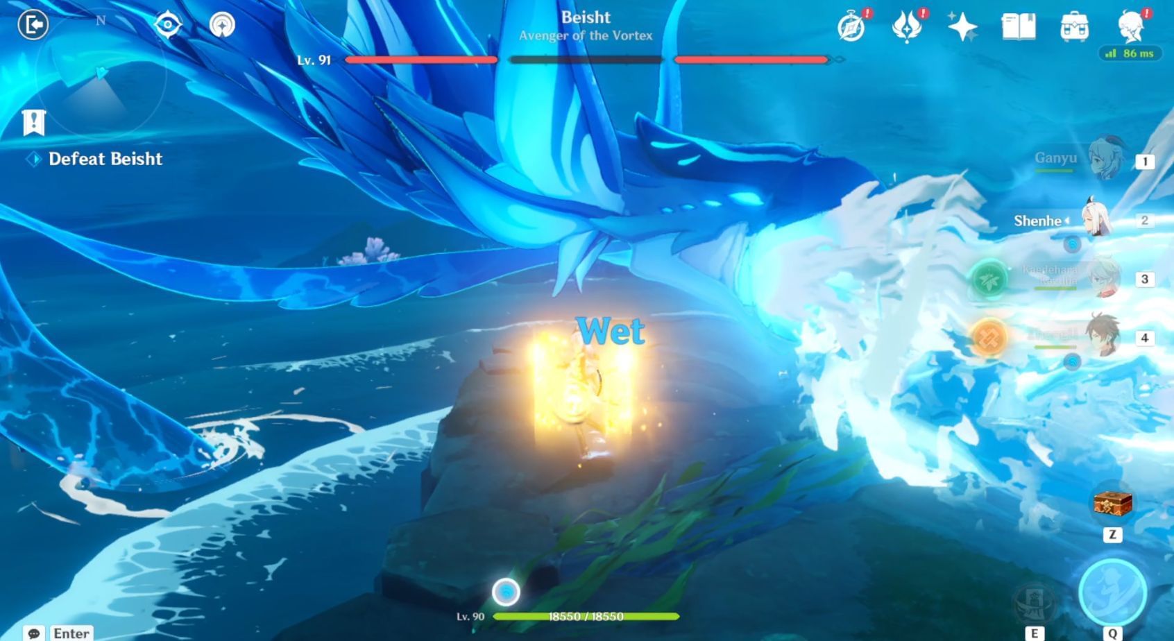 Beisht has a total of five attack skills, and one of them is the Jetstream attack. The Jetstream attack is when the enemy lowers her head into the platform, sucking nearby players towards her before launching a powerful water beam and dealing AoE Hydro damage. As players can't be hit by this skill even once to complete the task, they should immediately run away from the head that is charging its Jetstream.