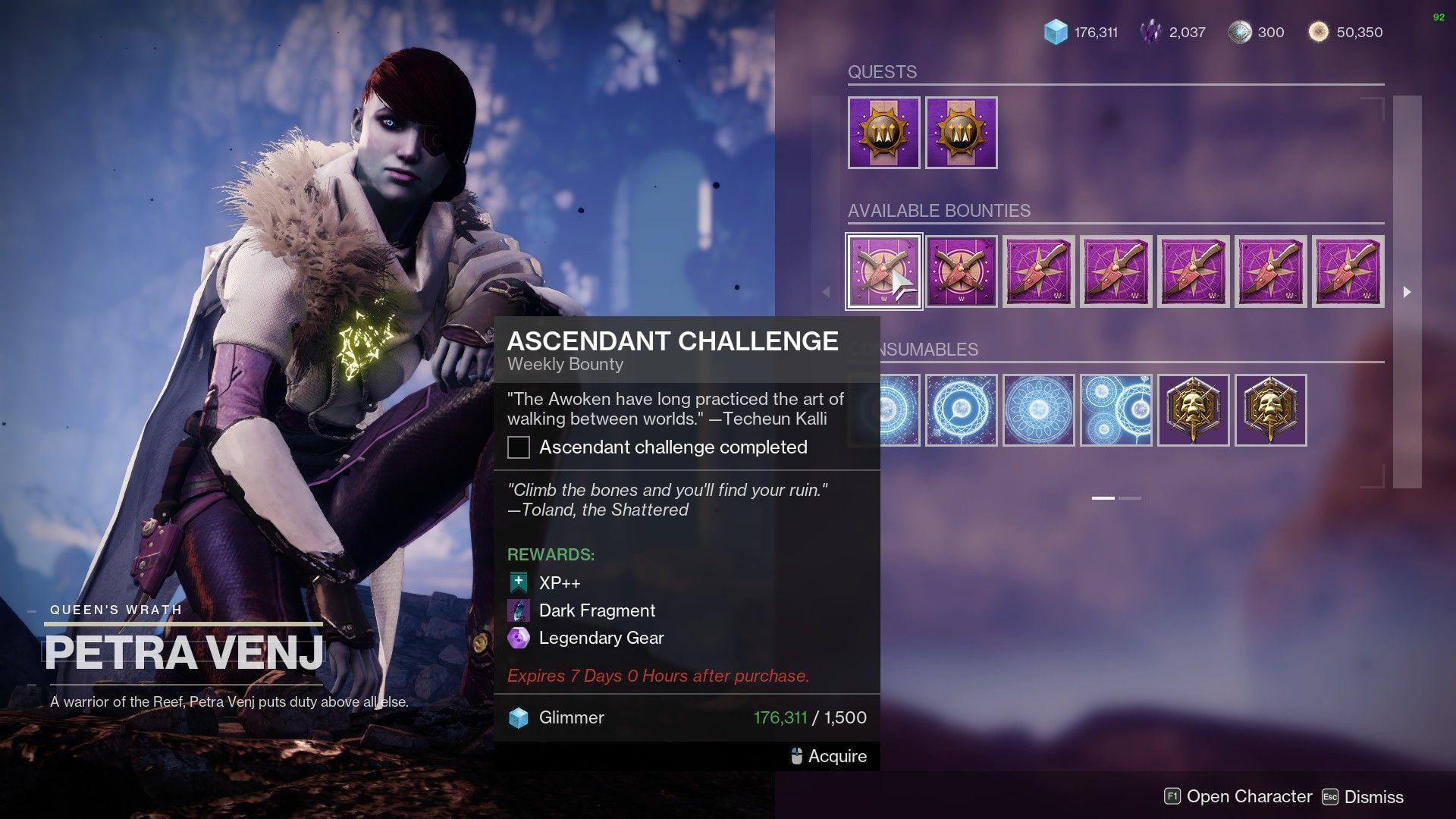Daily bounties from seasonal vendors expire once an expansion arrives, so they should be picked up for bounty preps or hoarding. Some examples are War Table from Season of Defiance, Sonar Station from Season of the Deep, Ritual Table from Season of the Witch, Riven from Season of the Wish, and Shaxx from Into the Light/Hall of Champions.