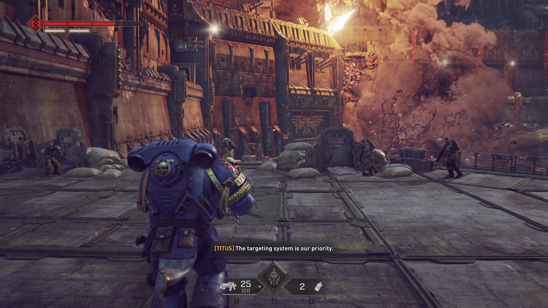 After clearing the horde, Sarkaana will inform Titus that the orbital guns are online but the targeting system is jammed and must be reset manually. Your objective is to reach the targeting system and reset it.