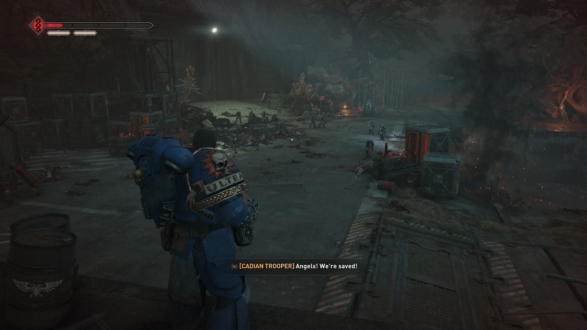 You must aid Iden's men in thinning the enemy herd. You will many large deposits of Ammo boxes as well as weapons such as the Auto Bolt Rifle and the Bolt Rifle with Grenade launcher, some of the best weapons in Warhammer 40k: Space Marine 2.