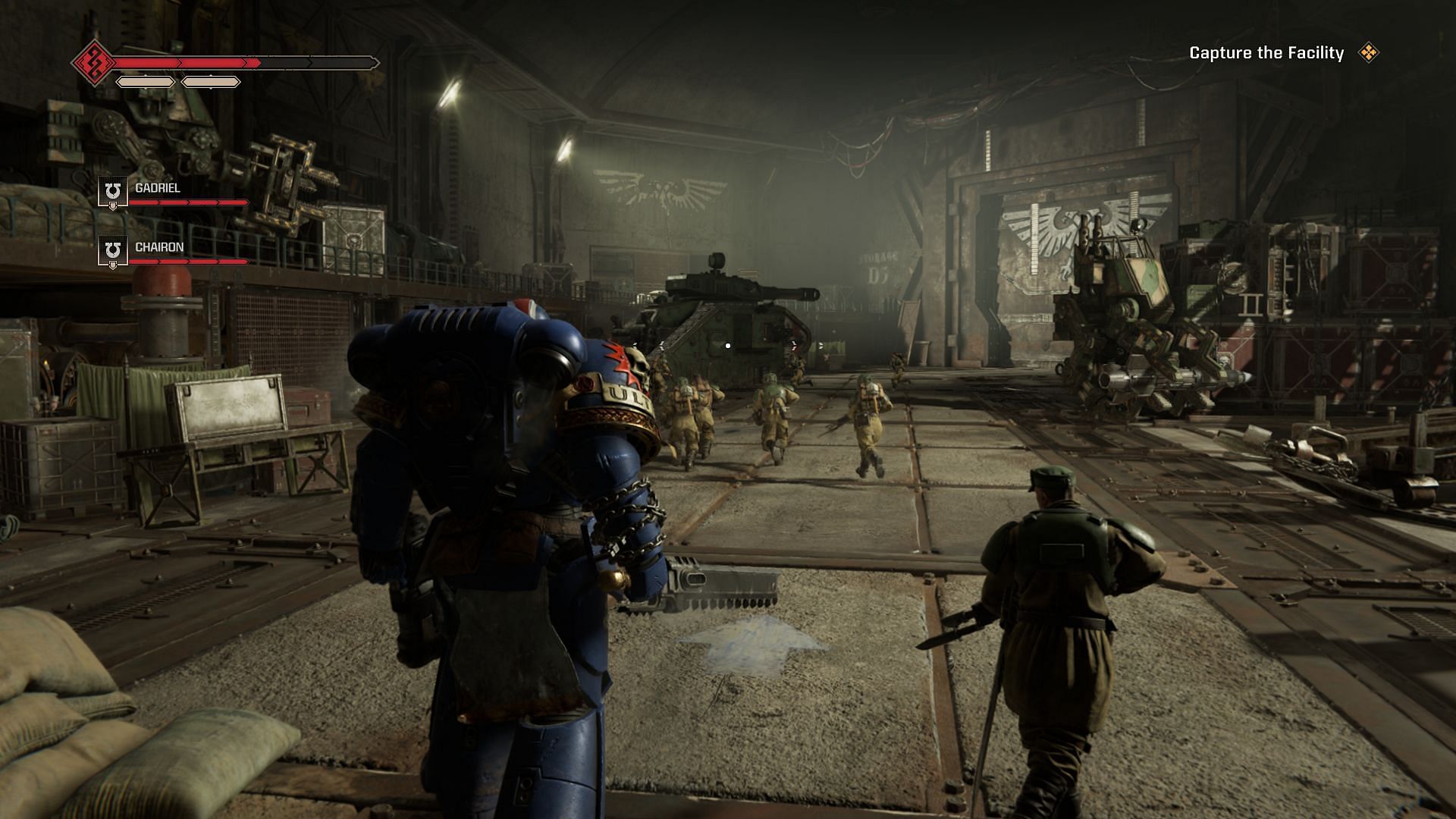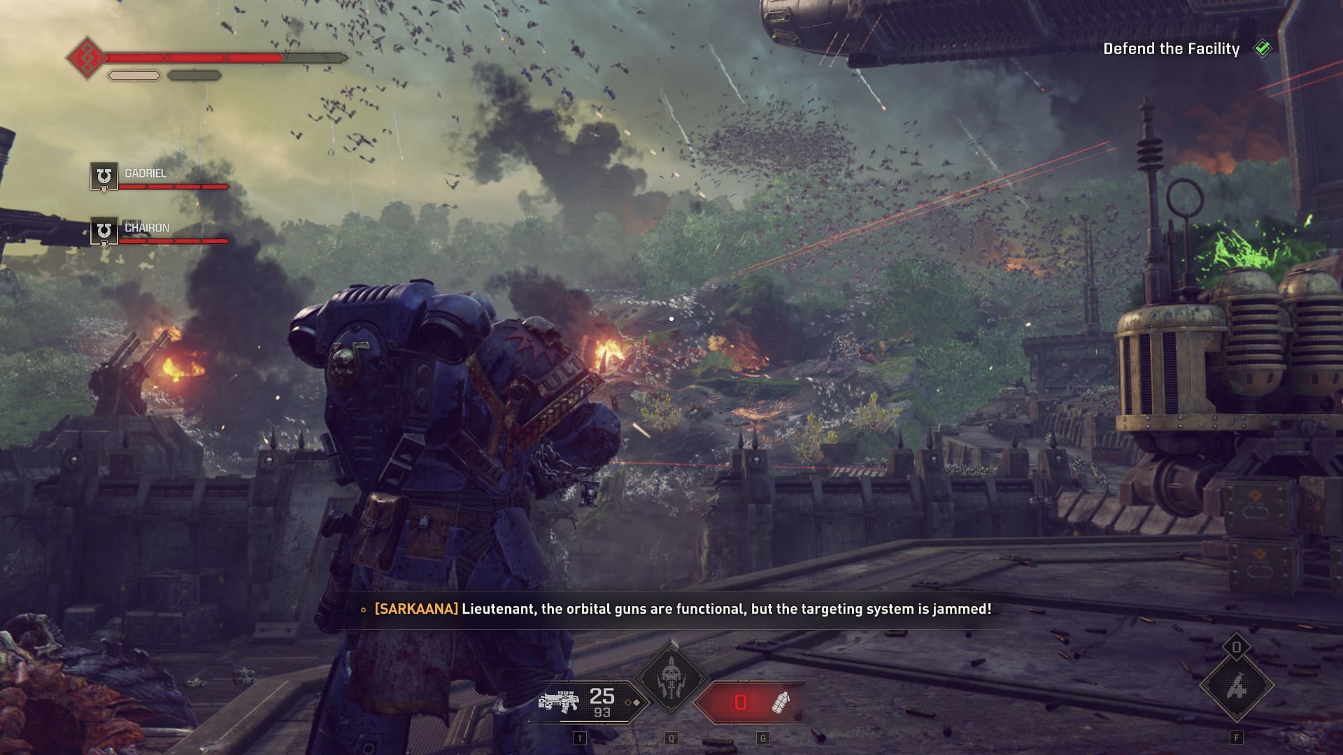 After some time, Titus lets the Major know that they have retaken the facility. Sarkaana heads towards the Facility to meet and regroup with Titus and his squad. This leads to a cutscene where the soldiers storm the control center to turn on the orbital guns. The soldiers inform Sarkaana and Titus that the guns are depleted and it will take some time for the machine spirit to wake up.