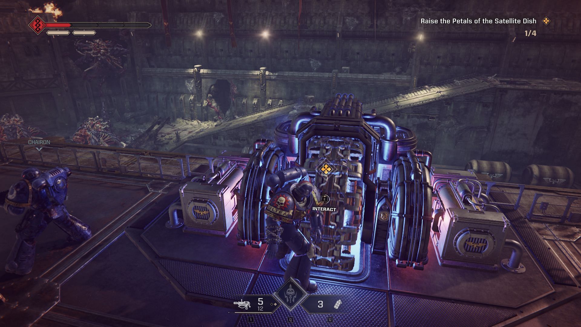 Head straight to the machine with the yellow marker and interact with it to rotate it and raise the petals of the Satellite Dish. There are four machines that you must interact with to raise the petals of the Satellite Dish and proceed further towards completing the Skyfire Campaign Mission in Warhammer 40k: Space Marine 2.