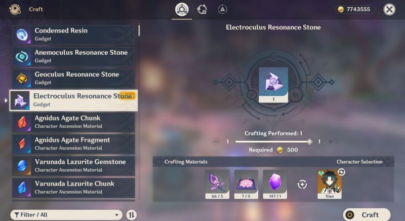 After that, go to any crafting bench located in Teyvat. Then, you can create Electroculus Resonance Stone by using 5 Naku Weed, 5 Sakura Bloom, and 1 Amethyst Lump for 500 Mora. The gadget will be permanently available in your inventory under the gadget tab.