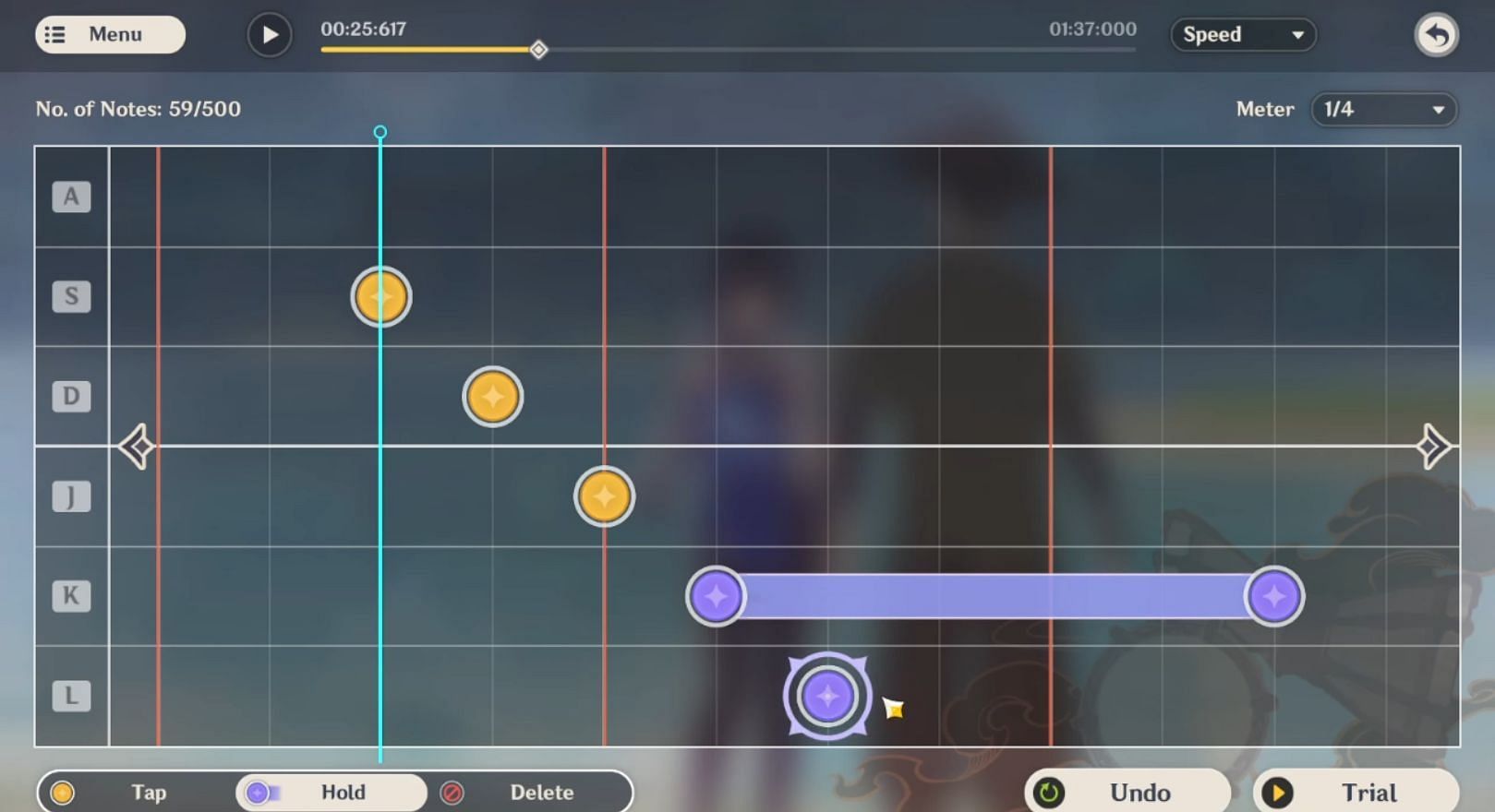 For the Normal Editing mode, gamers can click on the input button (keyboard for PC, tap for mobile) to add a single note at the current moment. For a long note, they can hold the input button during the music playback.