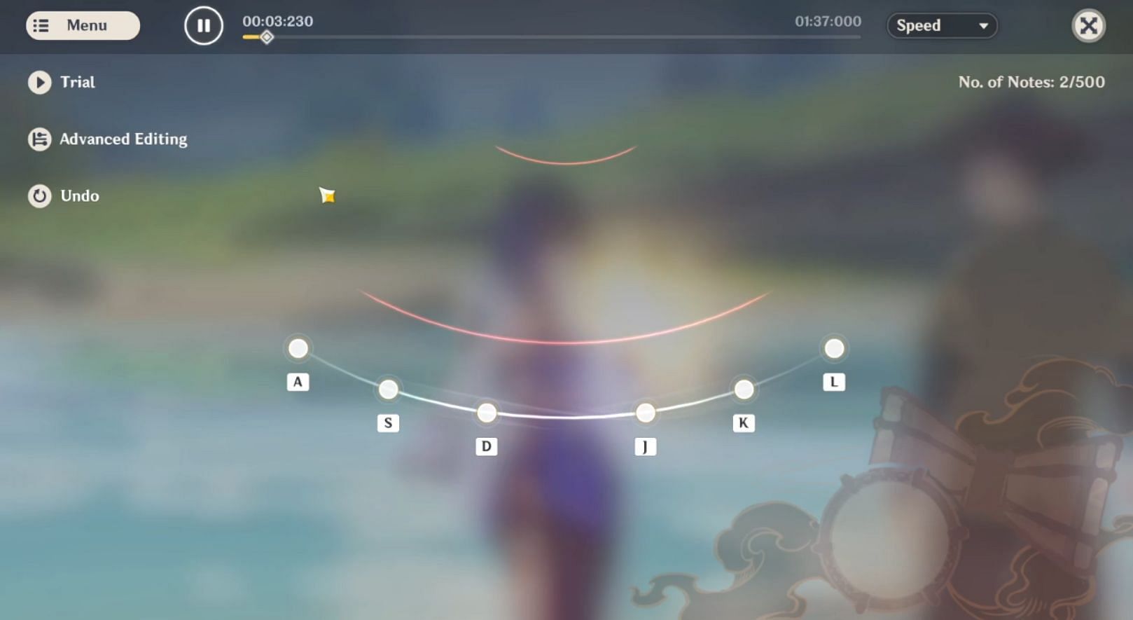 The Advanced Editing mode is more complex than the normal one. Genshin Impact players can select the type of note they want to add from the bottom of the screen, and that note will be added to the closest available time scale line. A long note can be created by selecting the beginning and ending notes on the scale line.