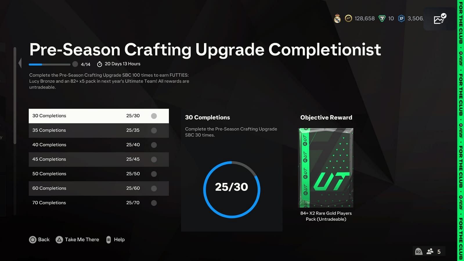 To work through the various segments of the objective, gamers have to repeatedly complete the Pre Season Crafting Upgrade SBC, which requires 11 gold players, including one rare gold player. The SBC is easy to complete and provides a 80+ x 3 players pack on each completion.
