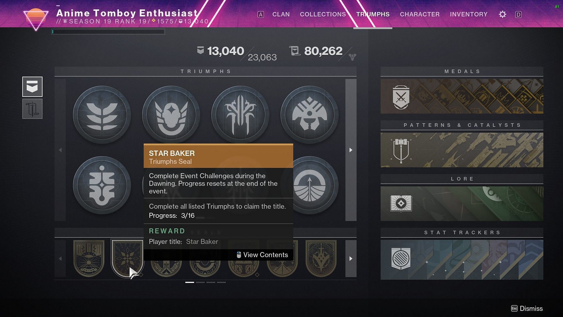 As mentioned earlier, this year's Dawning challenges in the event card ties in directly with the triumphs required from the Star Baker seal. Hence, following through with all objectives will simultaneously count towards the seal's progress. The triumph list containing all sixteen common goals includes: