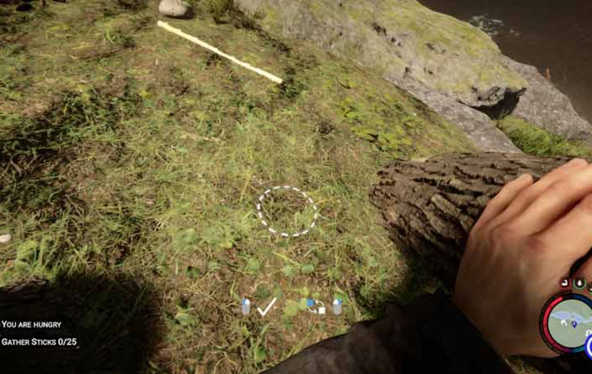Once you have a log in your hands, look at the ground for a circular outline with a couple of prompts. Press the LMB prompt to place a log on the ground successfully.