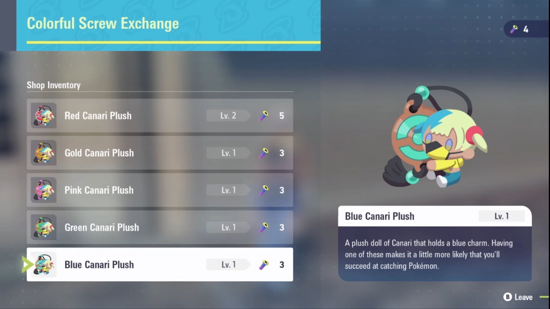 The price of a Plush doll starts at three Colorful Screws for the base level, and it is gradually increased as you try to upgrade the item. Each of the Canari Plush dolls in Pokemon Legends Z-A has three levels. The price of a Level 3 doll comes to eight Screws, meaning that you have to explore the game to collect the required amount.