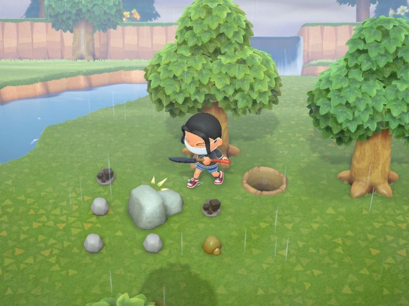 Now, players need to strike the rocks using shovels or axes. A wise idea would be to dig up holes near the rock to ensure that the items don't fly too far away, making it tedious for players to collect them.