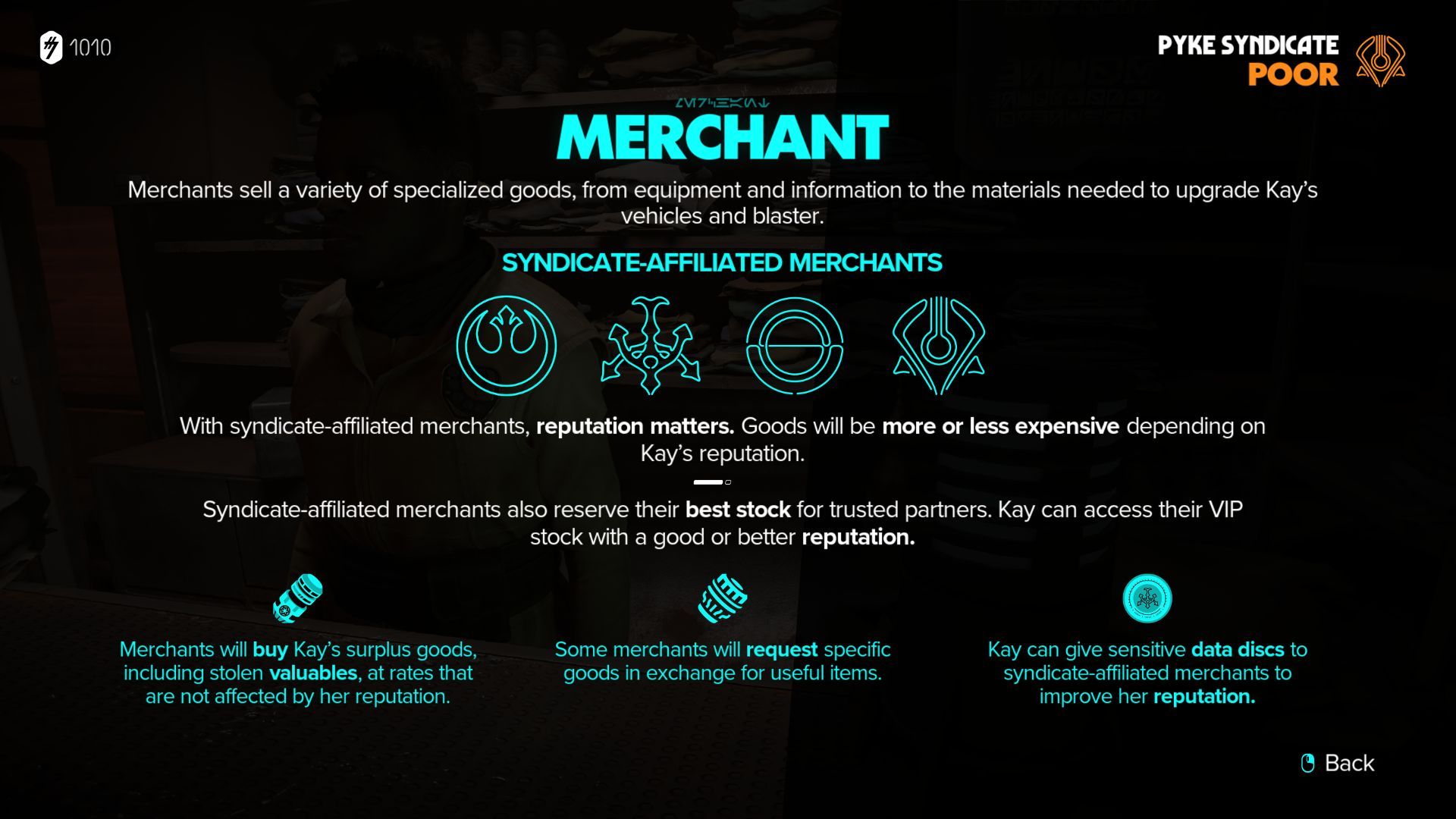 Now leave the planet and return immediately, which will replenish the merchant's stock, allowing you to buy Durasteel at a faster rate. Repeat this process to acquire tons of Durasteel at a cheaper price, thanks to your positive reputation on the planet.