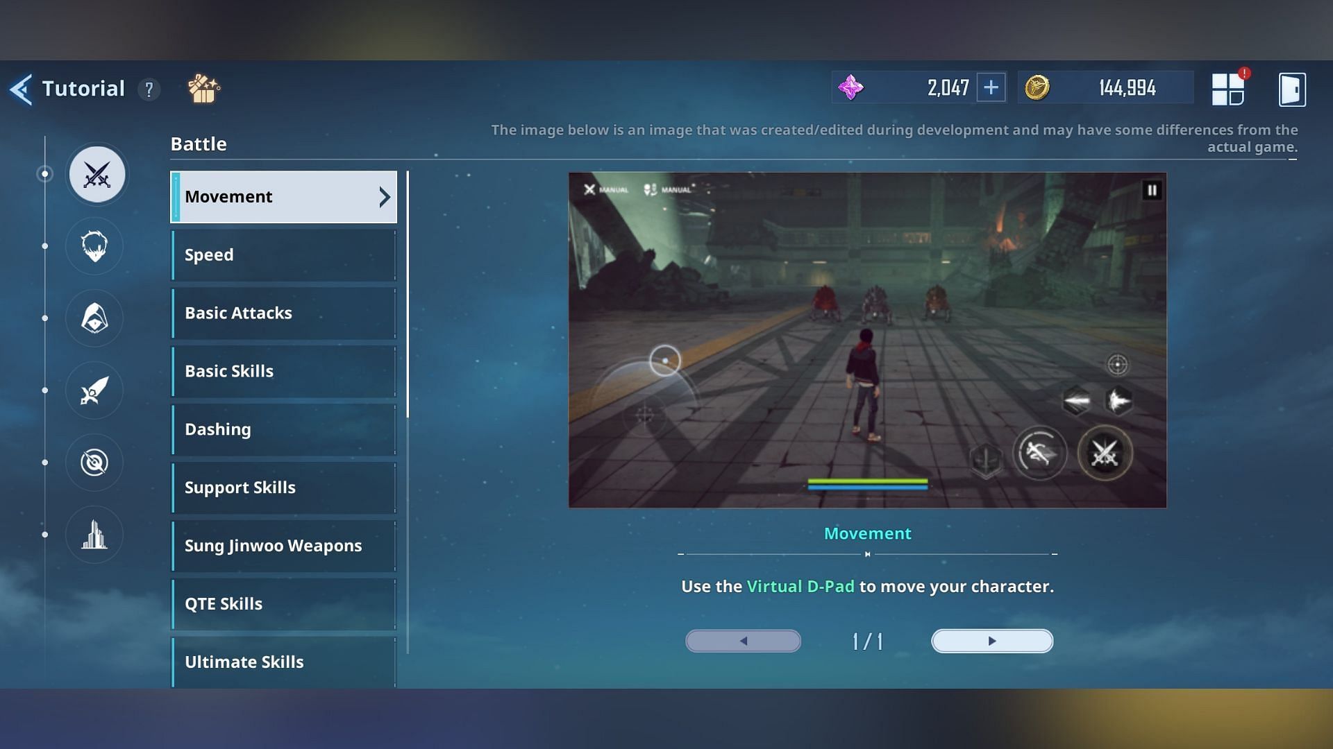 The tutorial is a one-time method to earn Essence Stones in Solo Leveling: Arise. You can learn about gameplay mechanics divided into various categories: Battle, Jinwoo, Hunter, Shadow, Equipment, and more. More tutorials will become available upon unlocking new content.